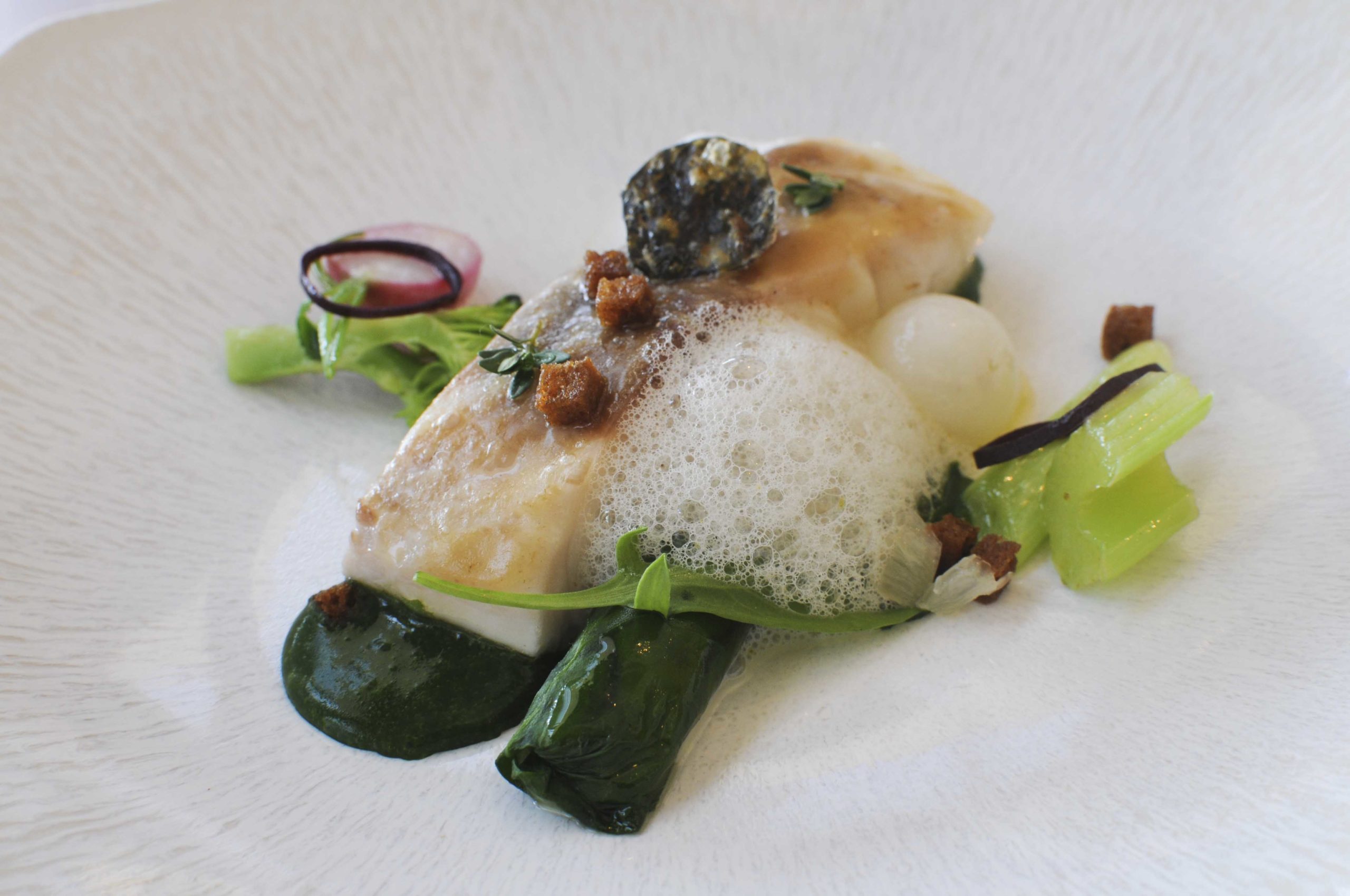 Encore un plat d’une grande finesse! Toujours d’une cuisson impeccable, le loup est servi avec un coulis de cresson, un bonbon d’huître (huître dans une feuille d’épinard), quelques légumes du moment (céleri, brocolis, navet…), des croûtons de pain de seigle et un bouillon iodé rafraichi au combava: le plaisir gustatif est énorme, on fait le plein d’iode et d’émotions.