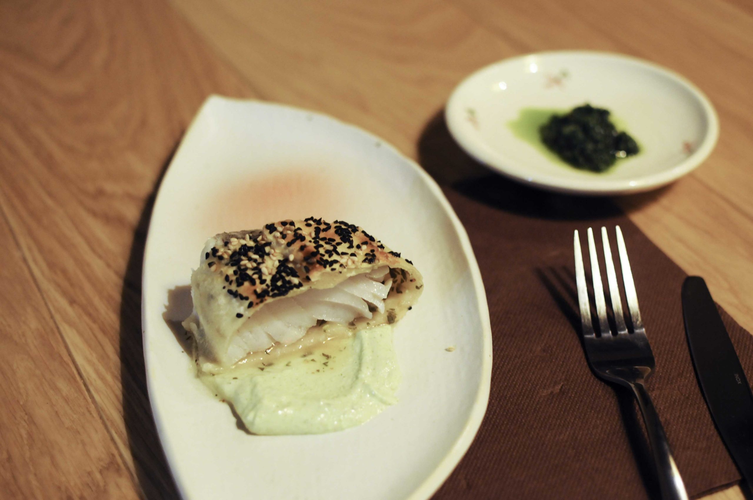 Lieu jaune en croûte de nigelle, citron confit, ail, épices, houmus aux amandes. Très très grand coup de coeur pour ce plat savoureux, superbement relevé par un condiment piment vert/ail qui lui apporte un joli peps!