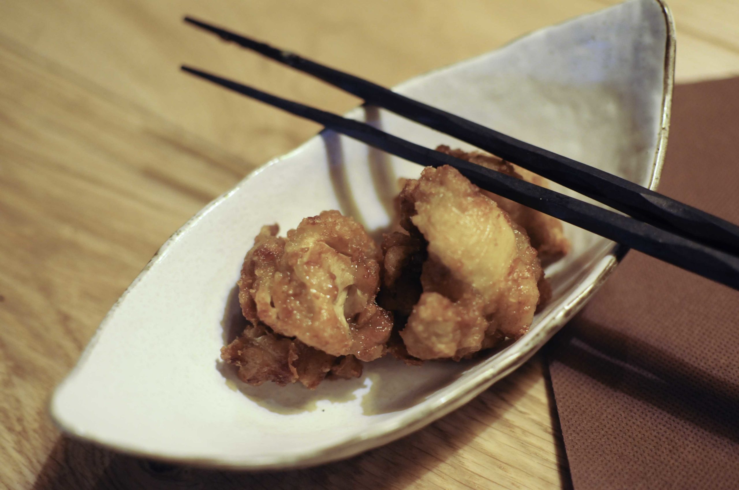 Poulet mariné au gingembre et saké puis frit. Perso j’y aurai peut-être rajouté un peu de gingembre pour relever encore davantage le poulet frit, mais cela reste très bon!