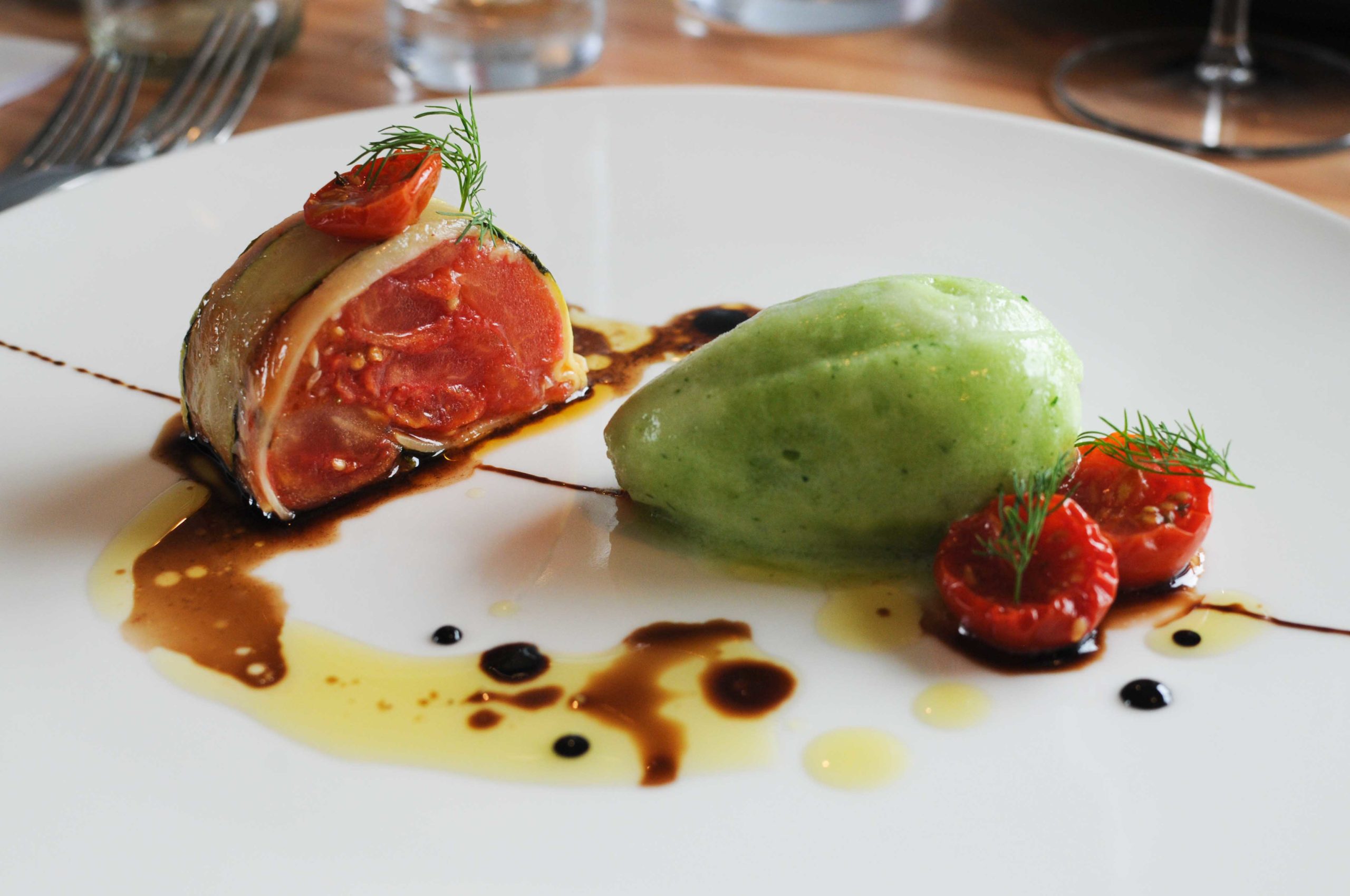 Pressé de tomates « Rose de Berne » et courgettes du maraîcher, rocher frais de concombre