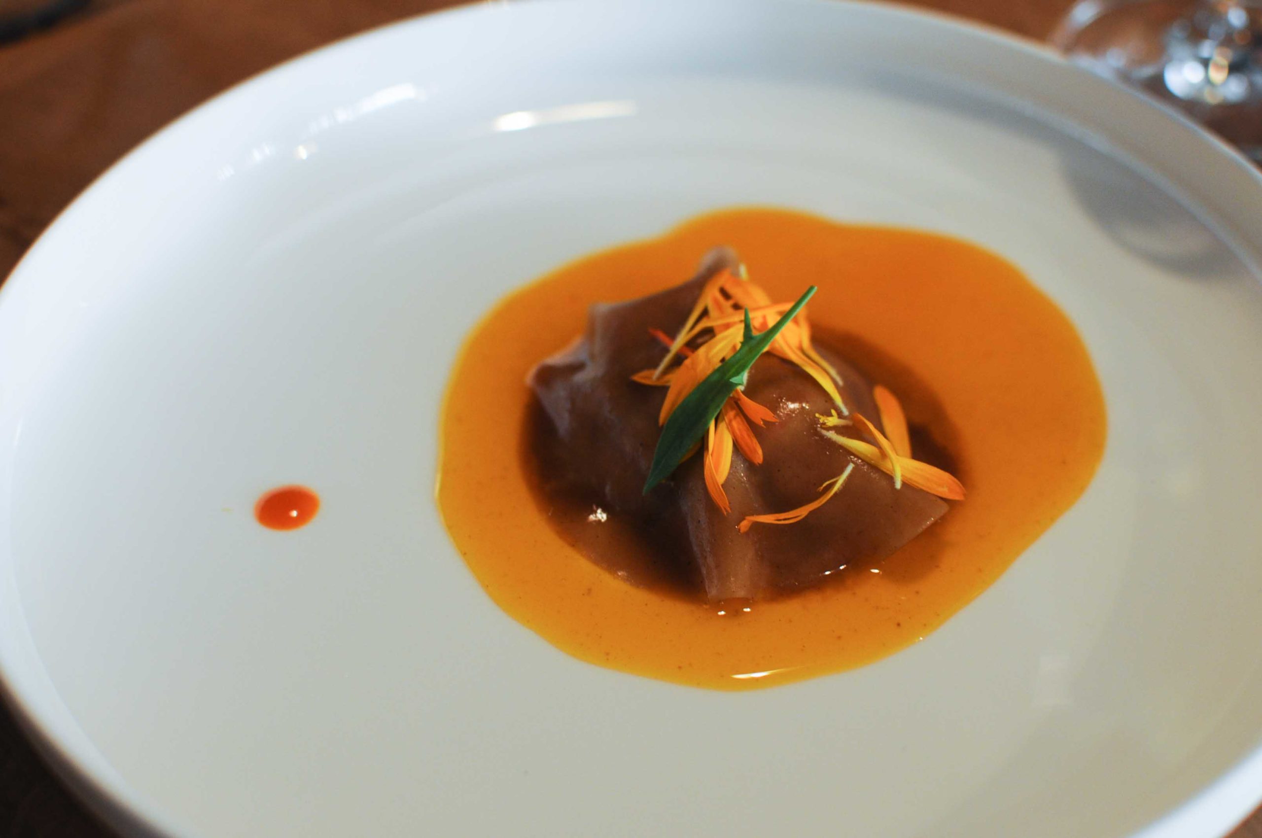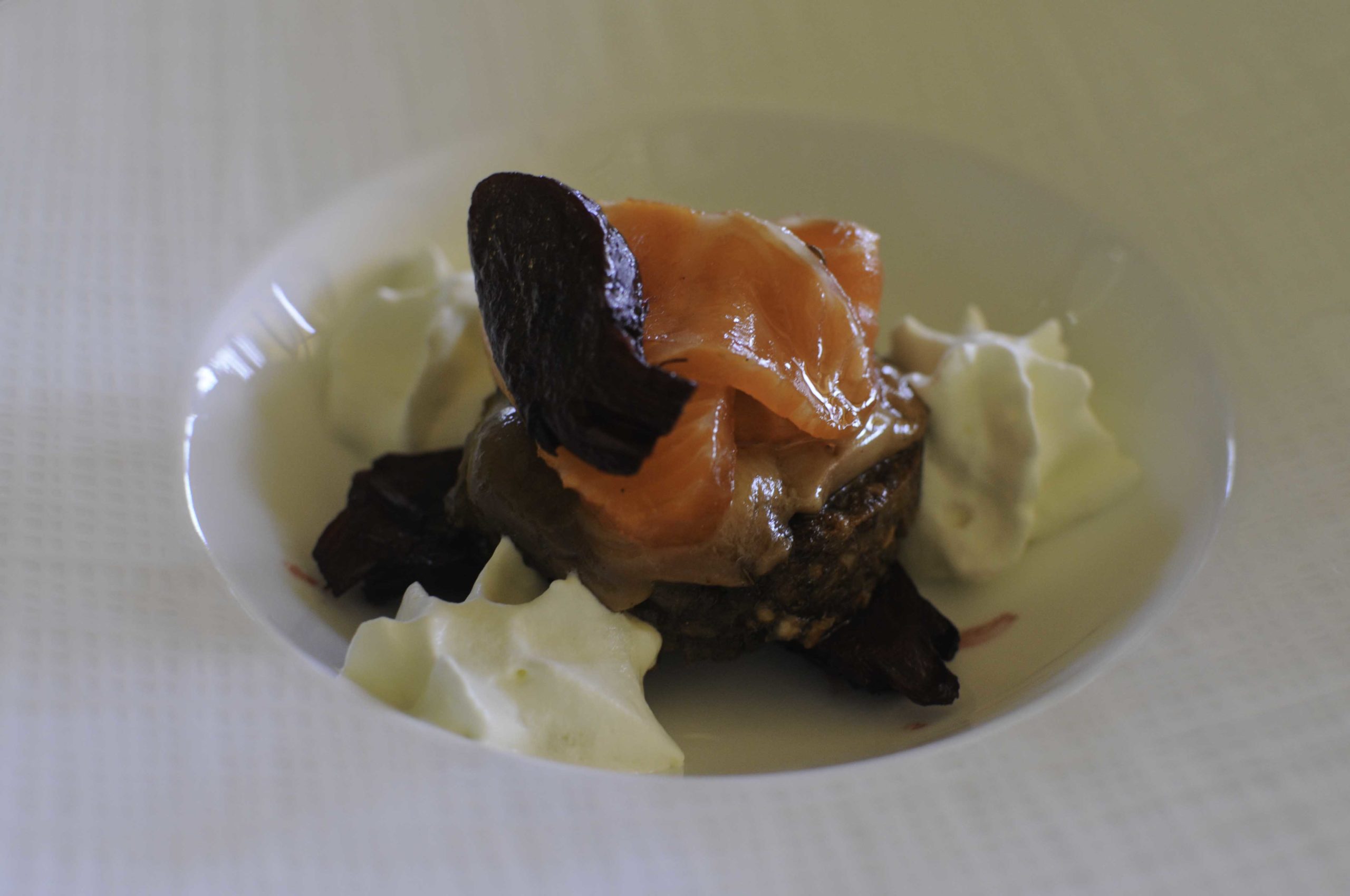 Truite et foie gras fumé accompagné d’un bouillon Bortsch parfumé et relevé.