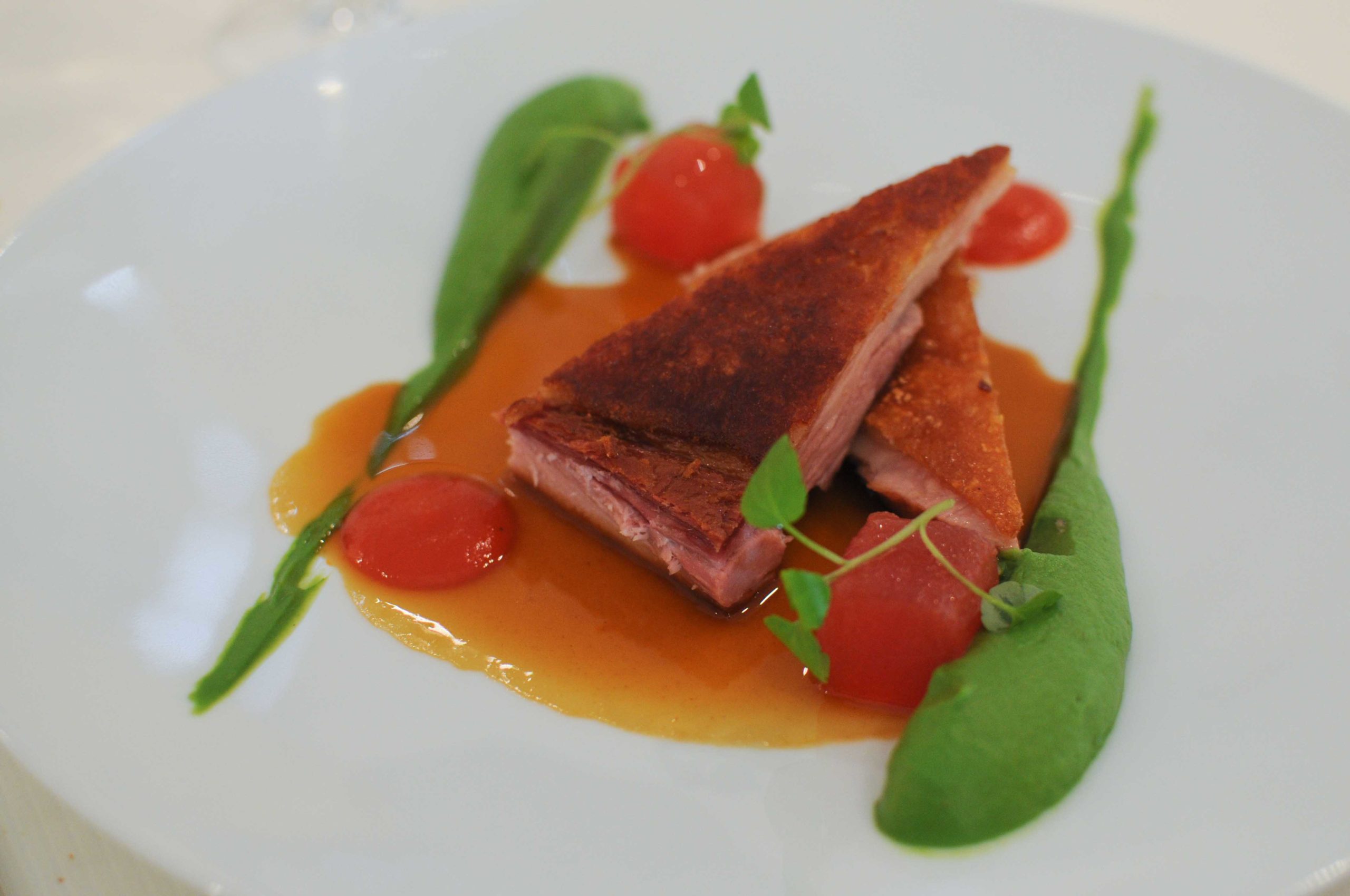 Cochon de lait croustillant, piquillos et pastèque