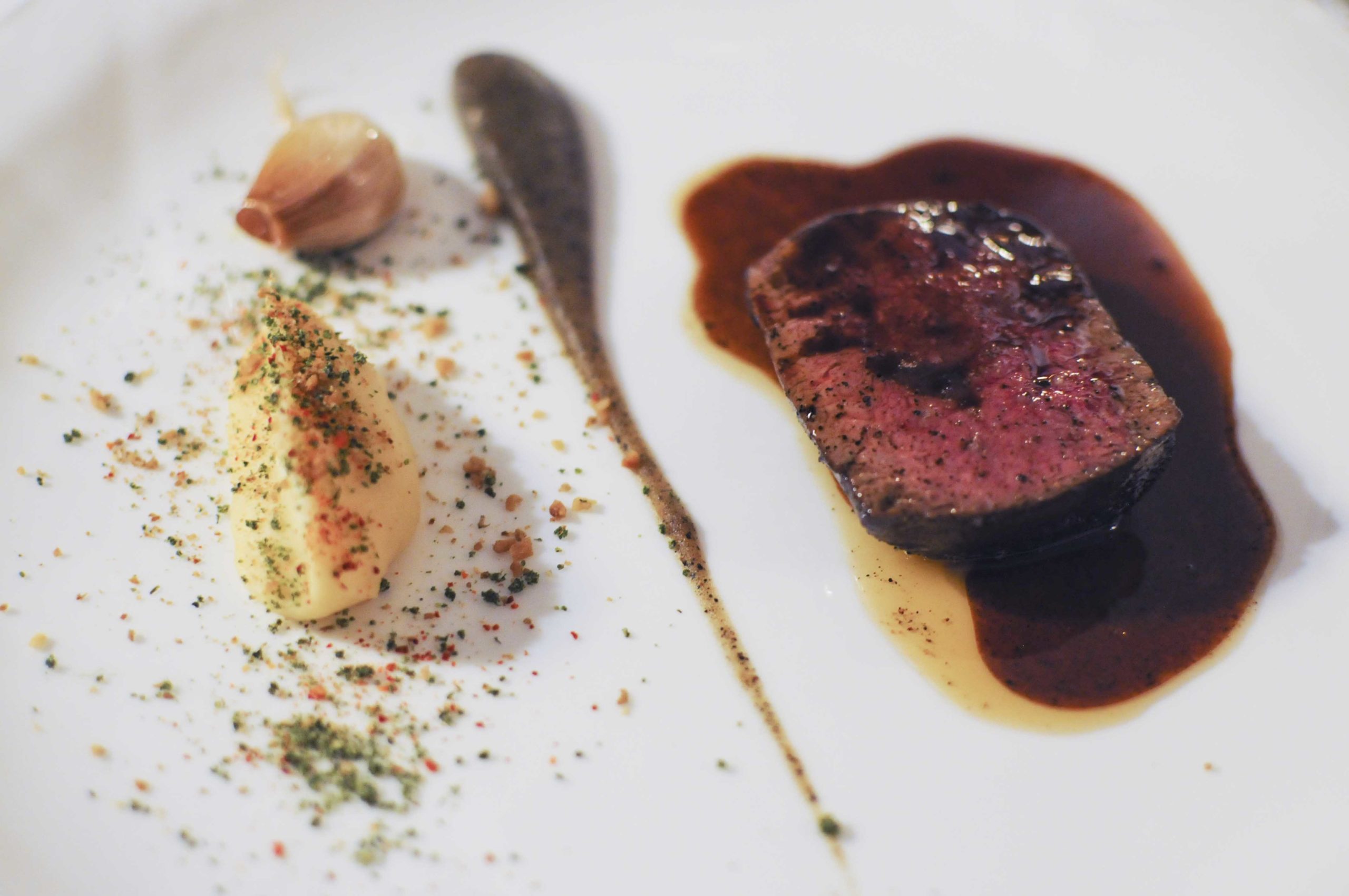 Chevreuil de chasse sauvage, condiment de pommes brulées, et purée de panais