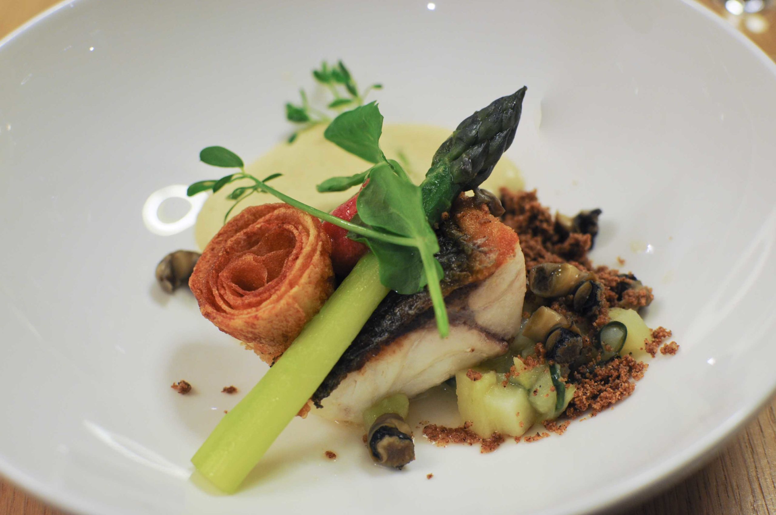 Pavé de bar, bigorneaux et asperges à la sarriette, cappuccino citron/yuzu