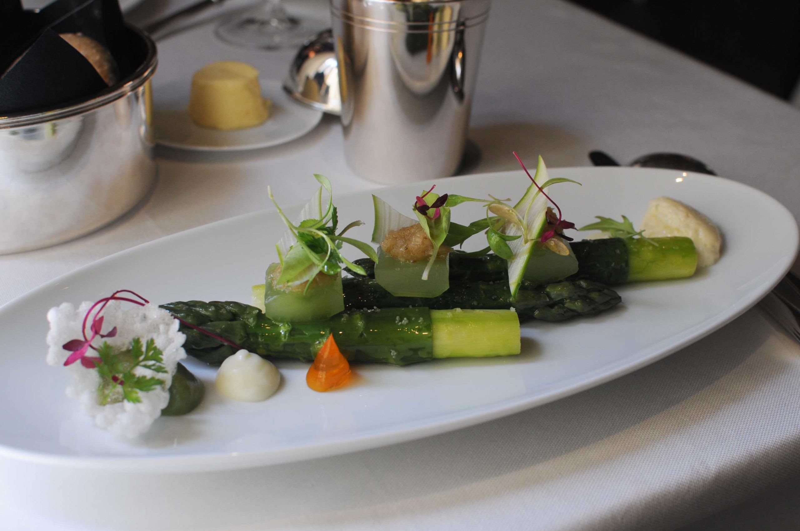 L’asperge verte, vinaigrette yuzu kosho, concombre, huile d’olive
