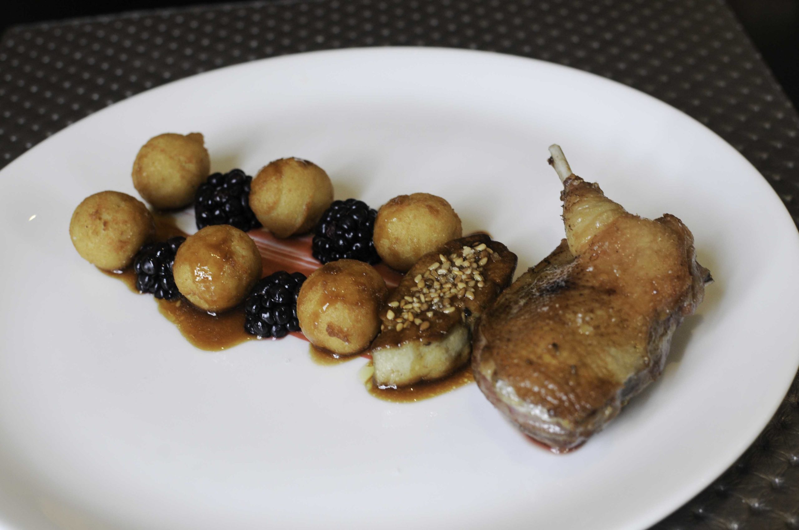 Pigeon de la Ferme de la Font des Loges rôti, pois chiche, foie gras, mûres et jus réduit
