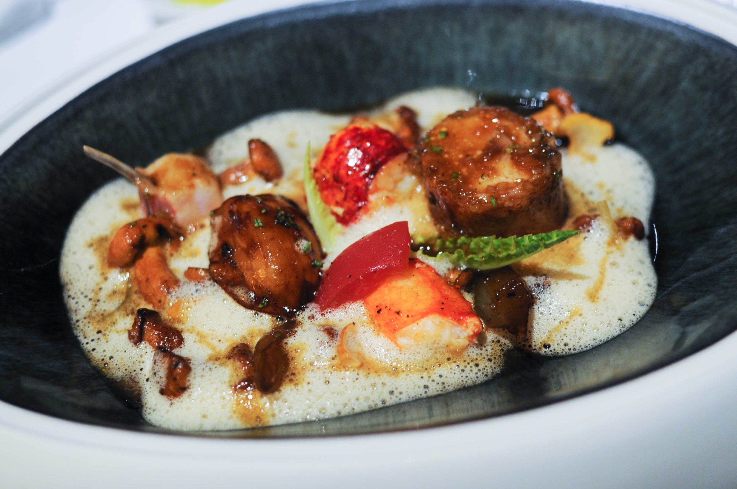 Le râble de lapin roulé au lard paysan « façon Claudette » et homard bleu, échalotes caramélisées et girolles au miel de châtaignier, jus corsé déglacé au vinaigre Barolo, bouillon mousseux au romarin