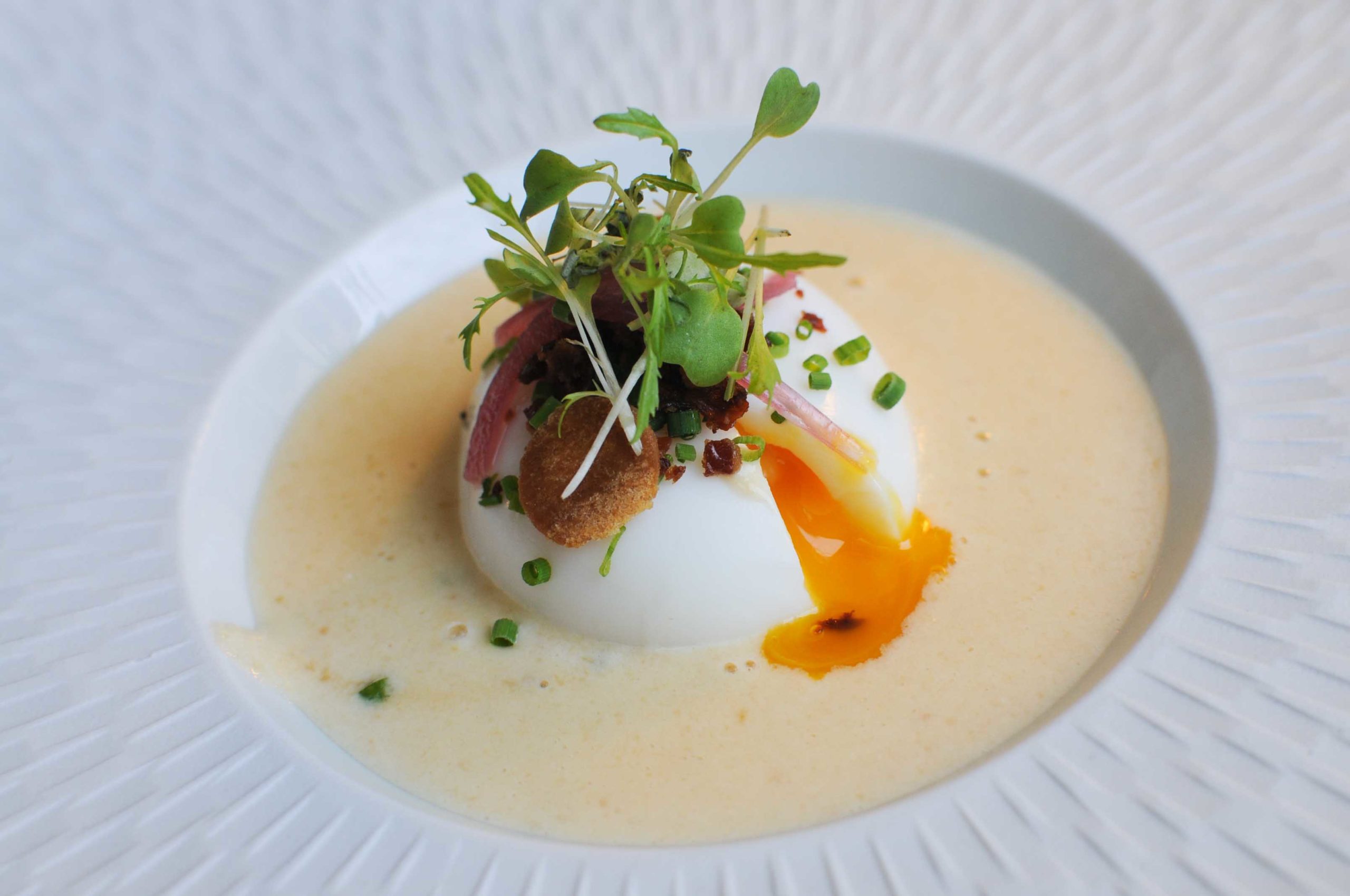 Oeuf mollet, confit d’oignon, bacon , crème de parmesan