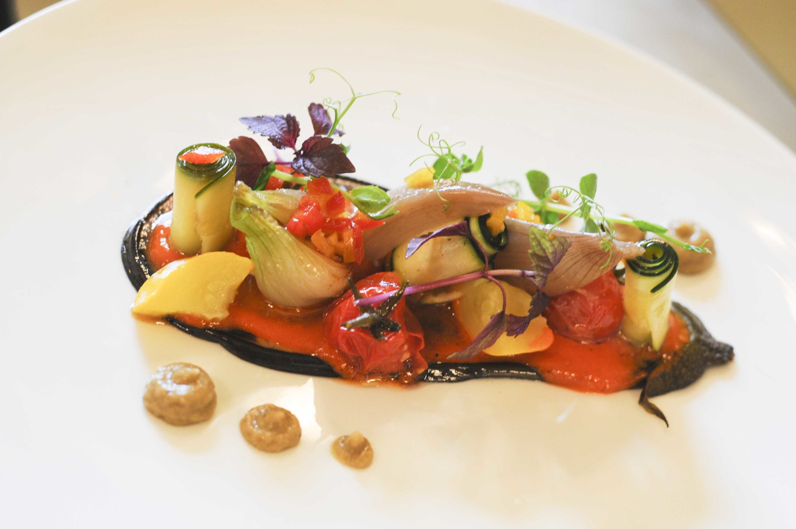 Légumes d’une ratatouille crus/cuits, vinaigrette Xerès et huile d’olive