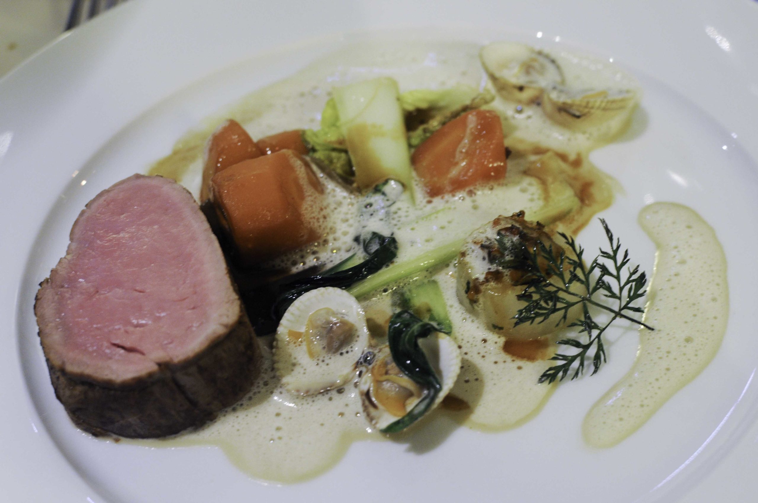 Mignon de veau rôti, coques et bouillon de coquillages