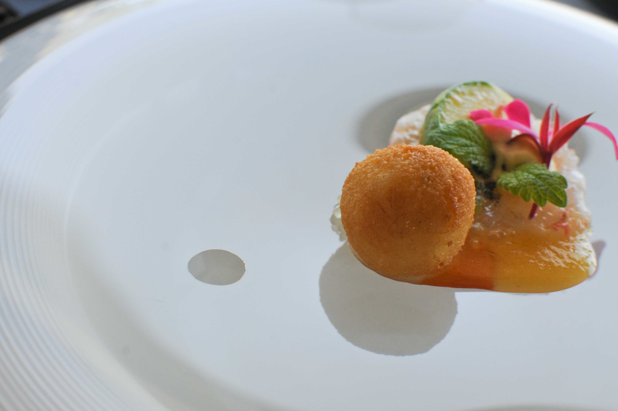 Cromesqui de homard, tartare homard/langoustine servi sur une assiette fumée