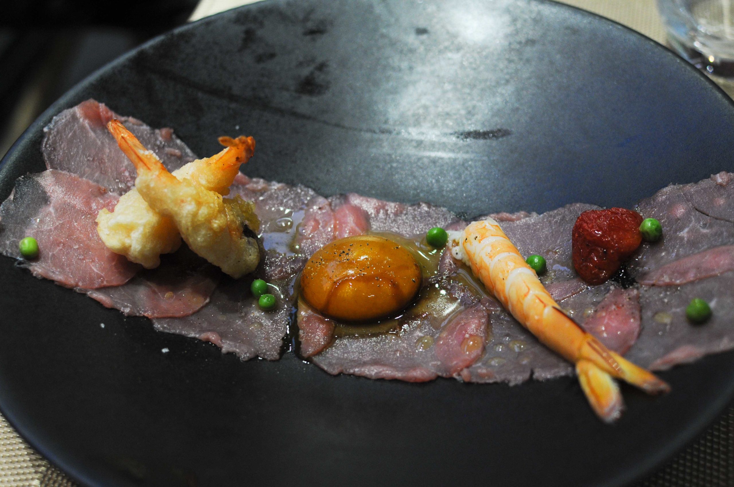 Carpaccio de veau, oeuf mariné au soja, gambas