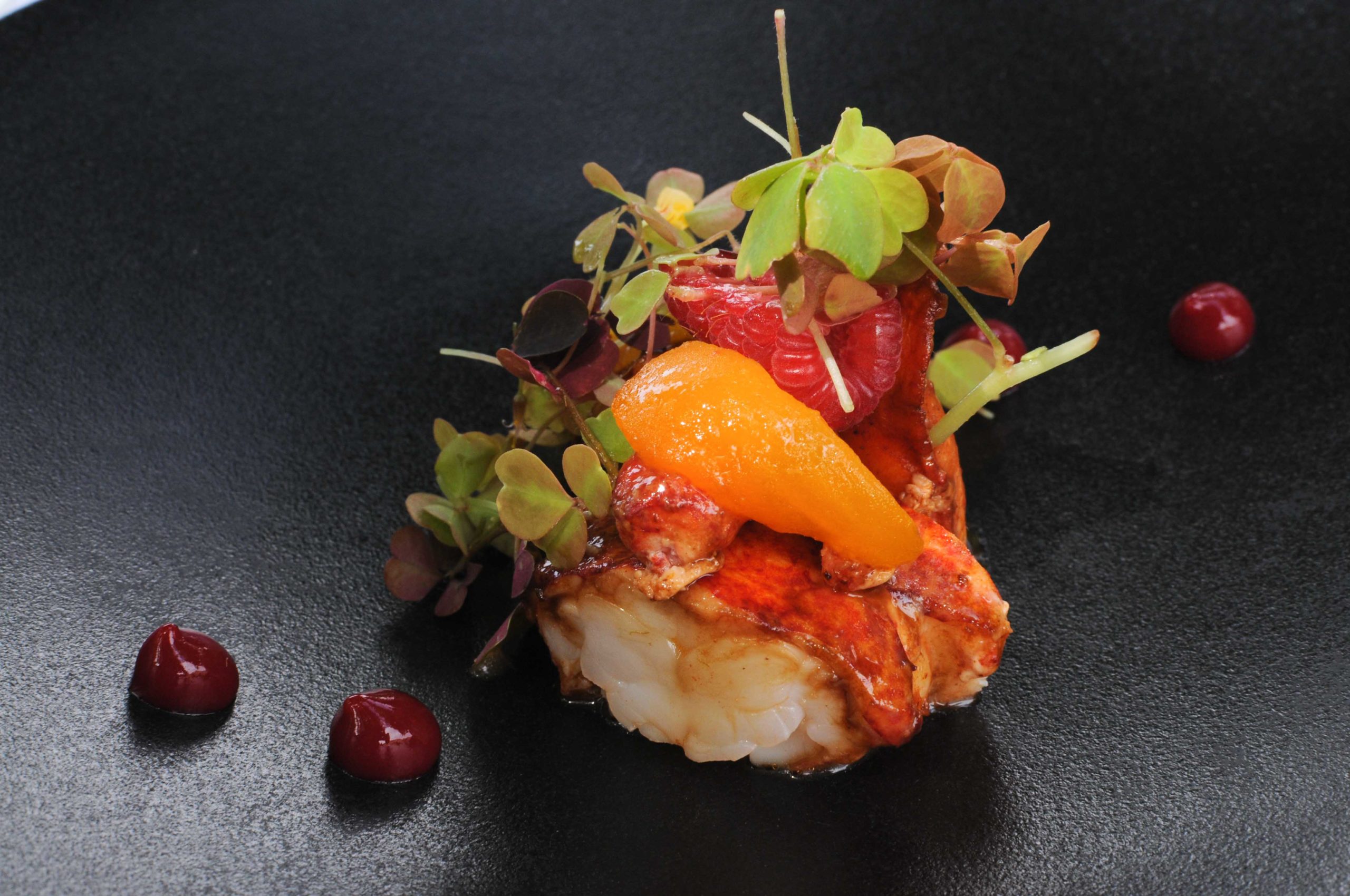 Homard bleu cuit dans une nage légèrement épicée, déclinaison de tomates, framboises et citron vert