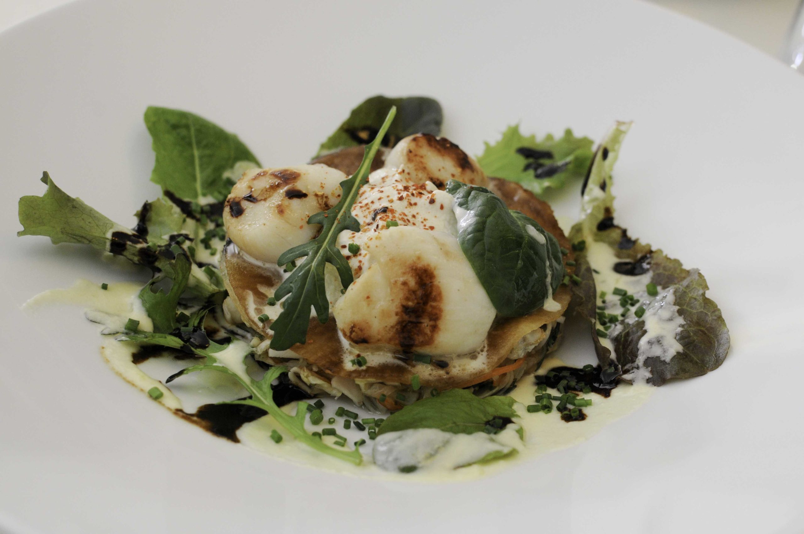 De fines lamelles de navet en guise de ravioles, une garniture composée de coques et de couteaux, des Saint-Jacques juste snackées préservant une chair nacrée et un jus crémé qui lie l’ensemble. C’est original, savoureux, une belle surprise gustative.
