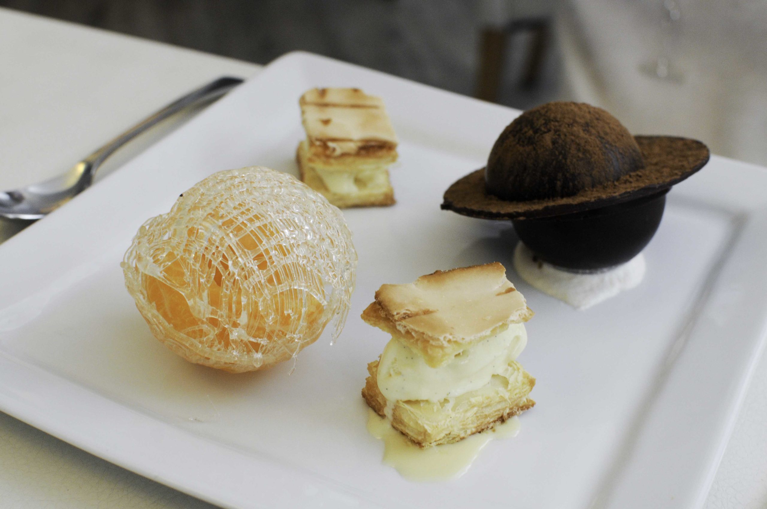 Une coque chocolatée avec une garniture aux marrons, des suprêmes de mandarines emprisonnés dans une sphère de caramel… une composition généreuse et gourmande qui comblent les palais sucrés. C’est très bon et quand on sait qu’ils ne sont que 2 en cuisine on se dit qu’ils assurent vraiment!