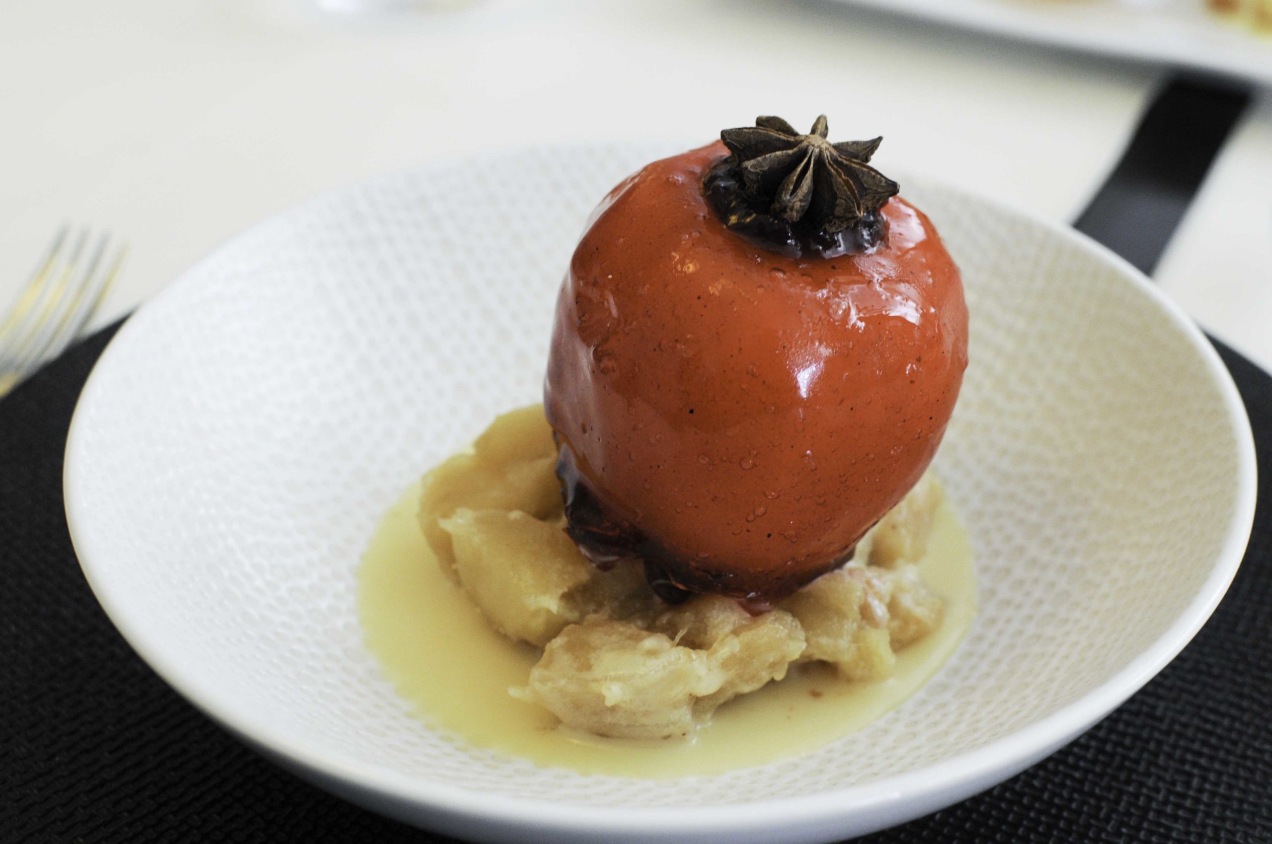 Il s’agit d’une pomme confite garnie de pulpe de framboises et recouverte d’une fine gelée de framboises. C’est encore très bien réalisé avec de belles associations gourmandes, l’assiette est repartie vide, c’est un signe 😉