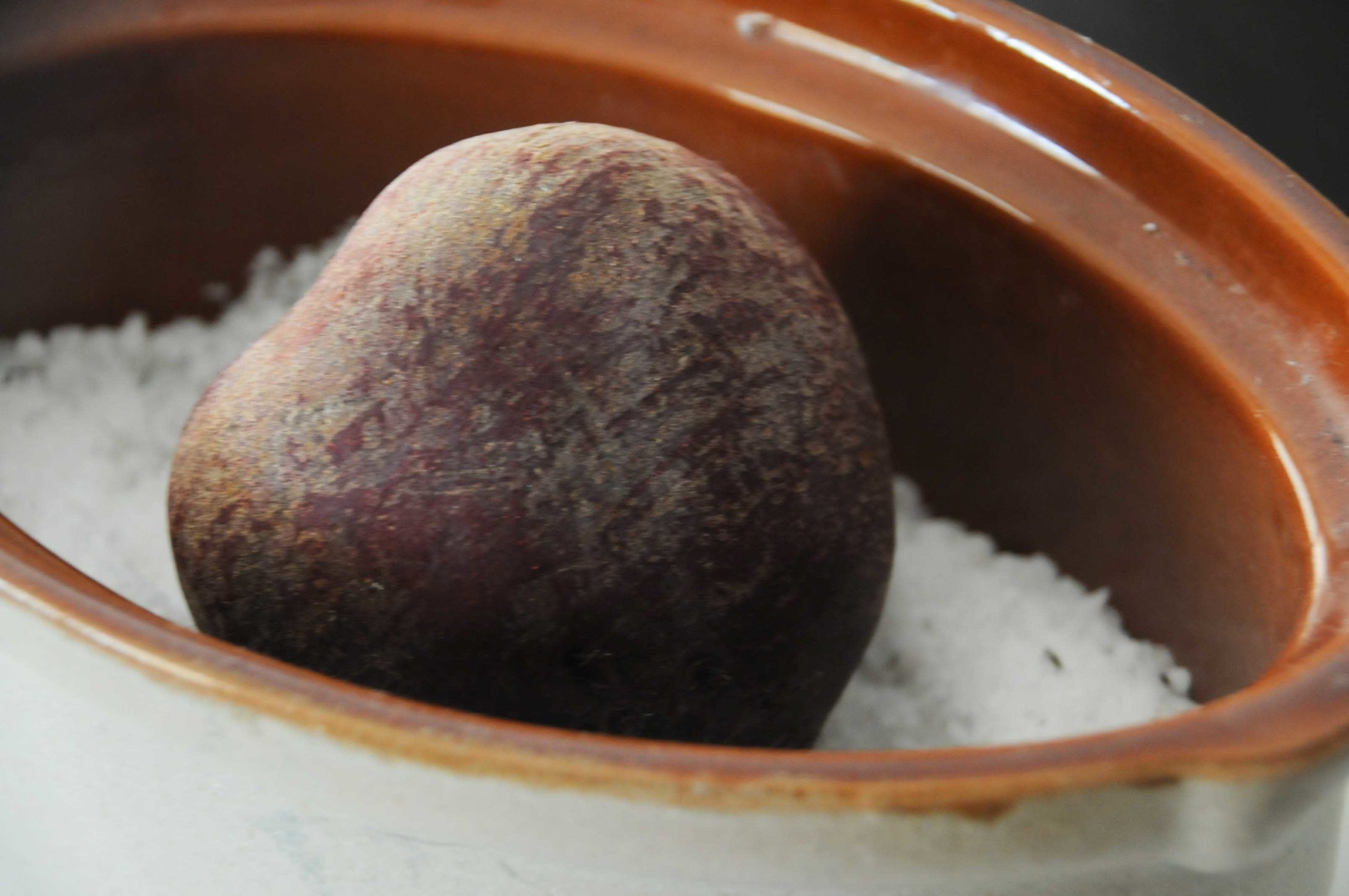 Déposer une couche de gros sel au fond d’un plat allant au four; poser la betterave et recouvrir complètement de gros sel.