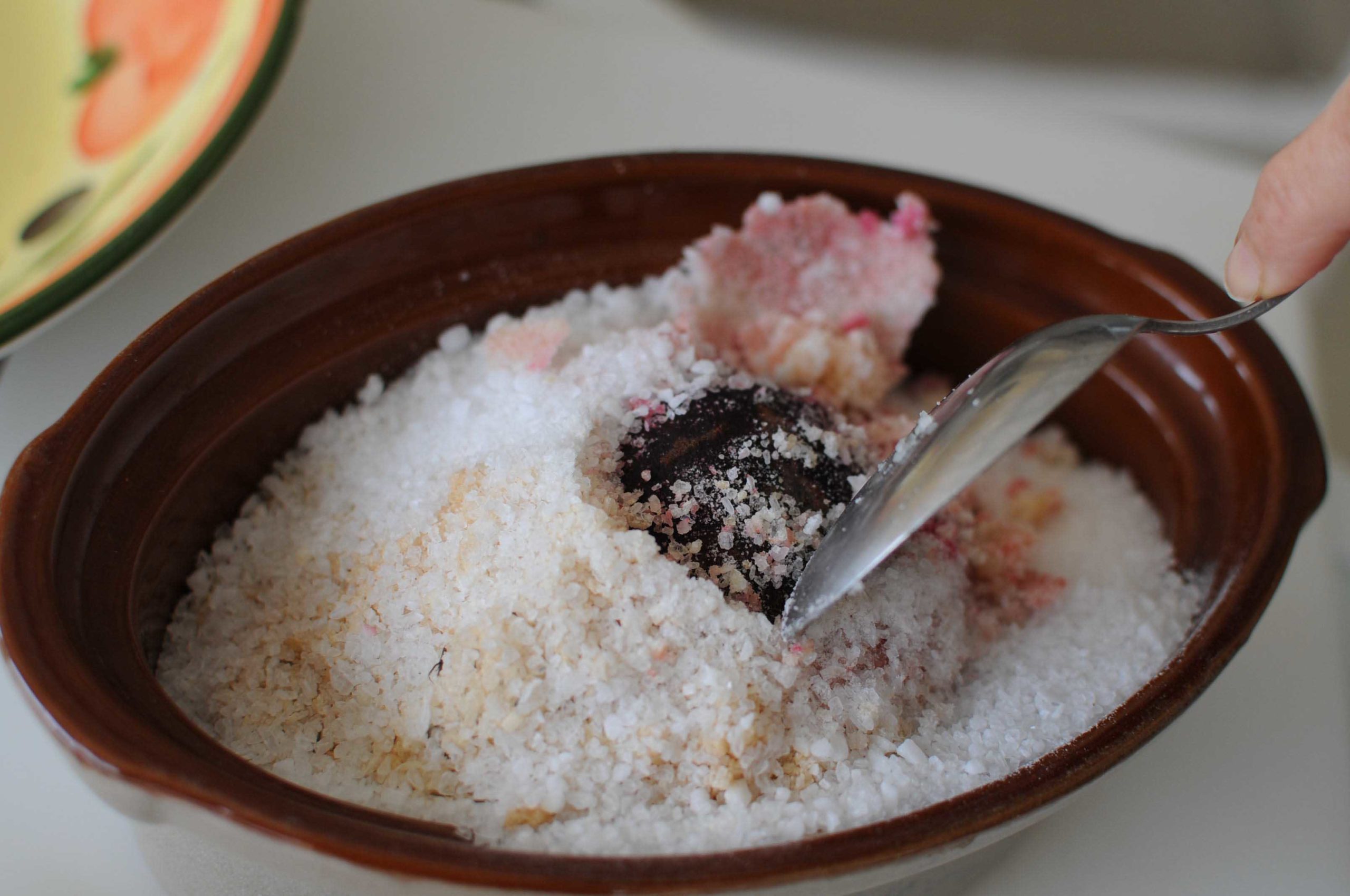 Enfourner dans le four préchauffé à 160 °C pendant 1 h 30. Laisser tiédir environ 30 minutes puis dégager la betterave de sa croûte de sel avec précaution.