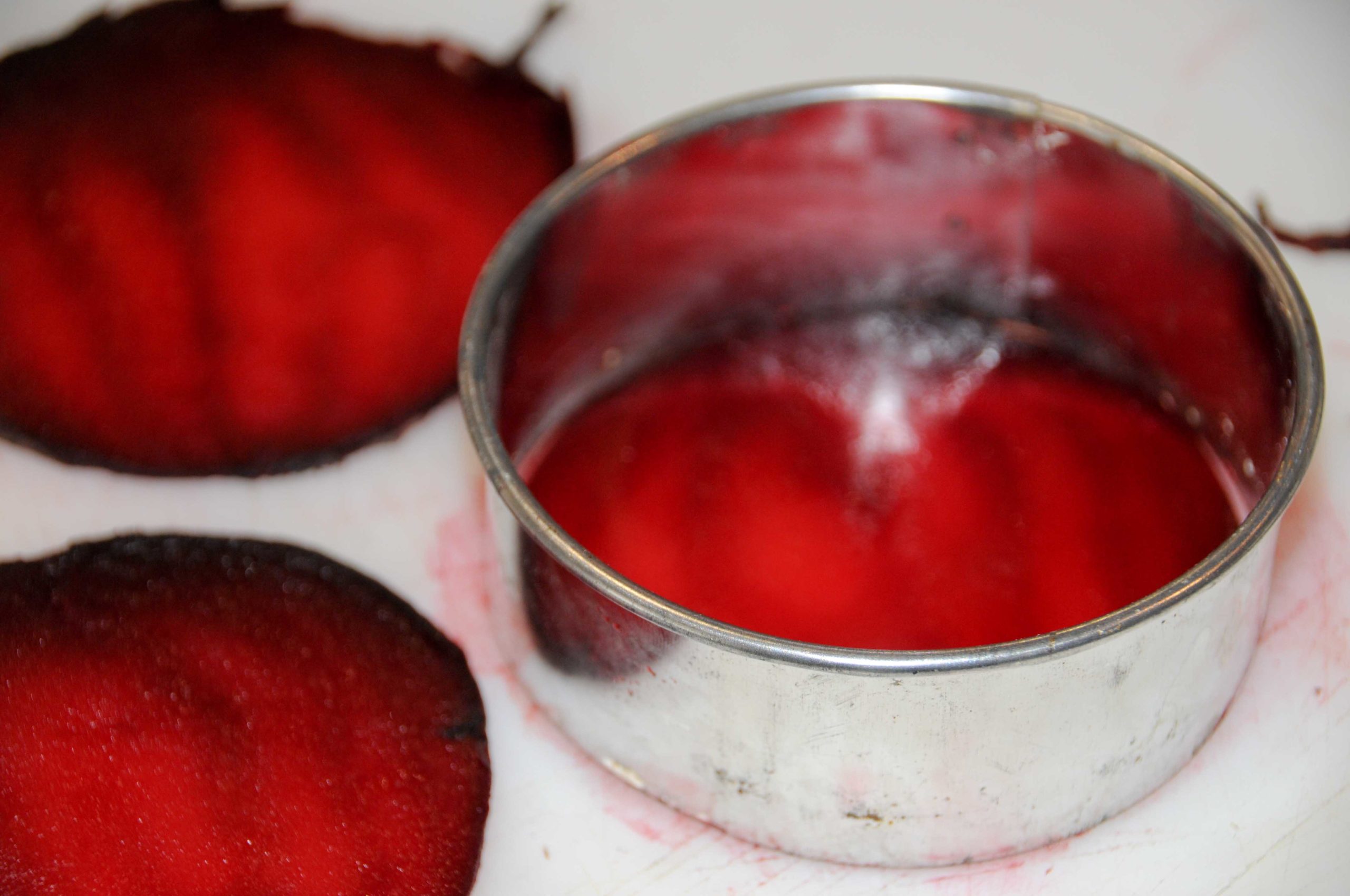 Couper la betterave avec une mandoline à la manière d’un carpaccio puis calibrer à l’aide d’un emporte pièce pour avoir des disques uniformes.
