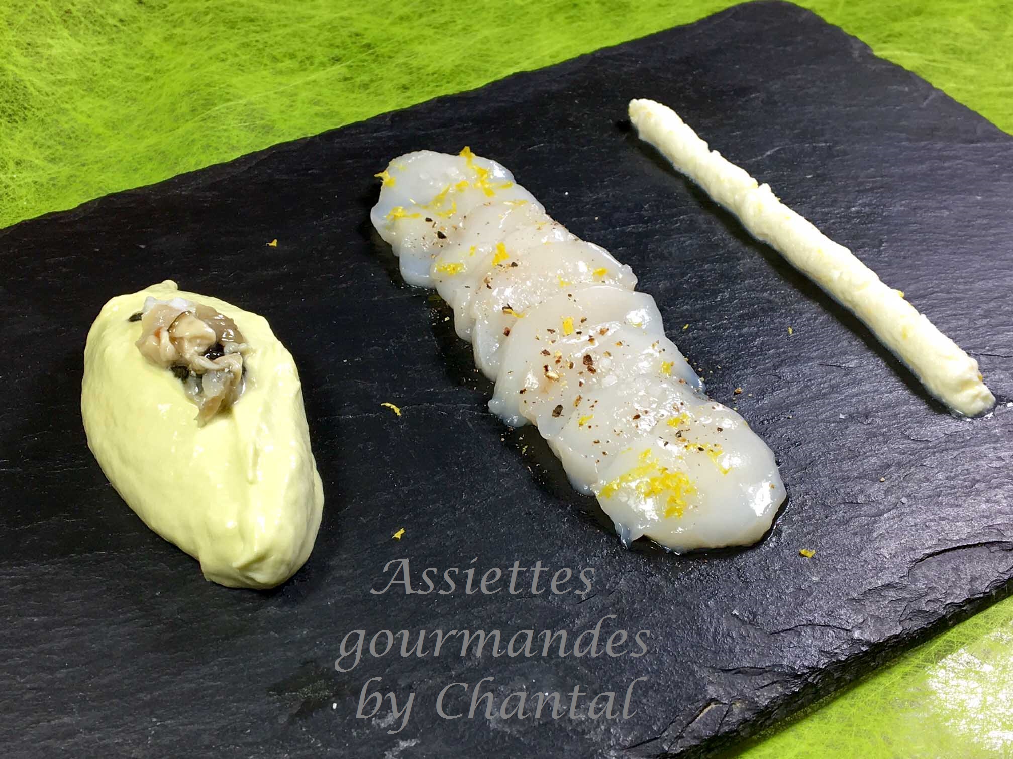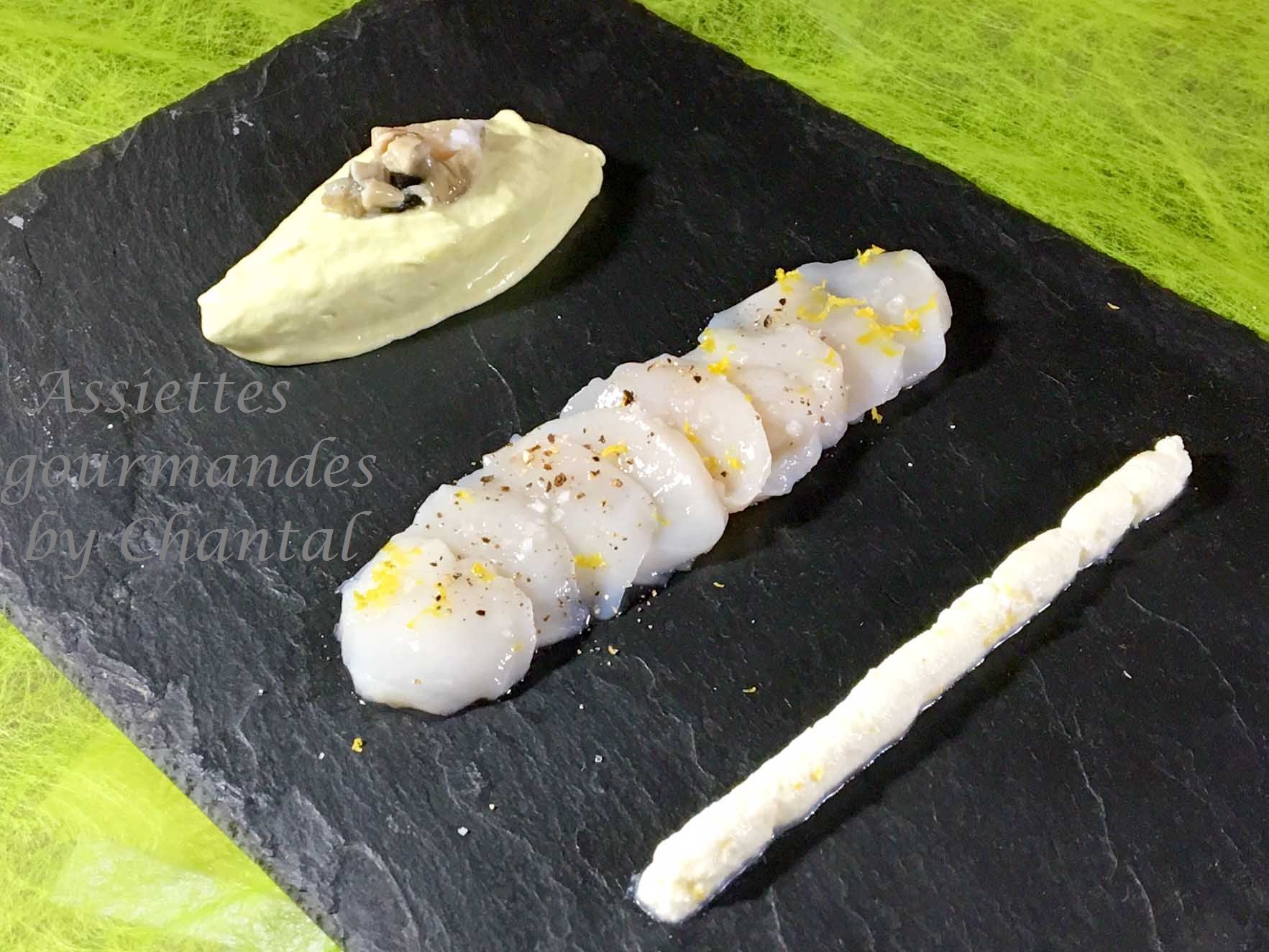 Saint-Jacques, bavarois de poireaux et huîtres en tartare![]()