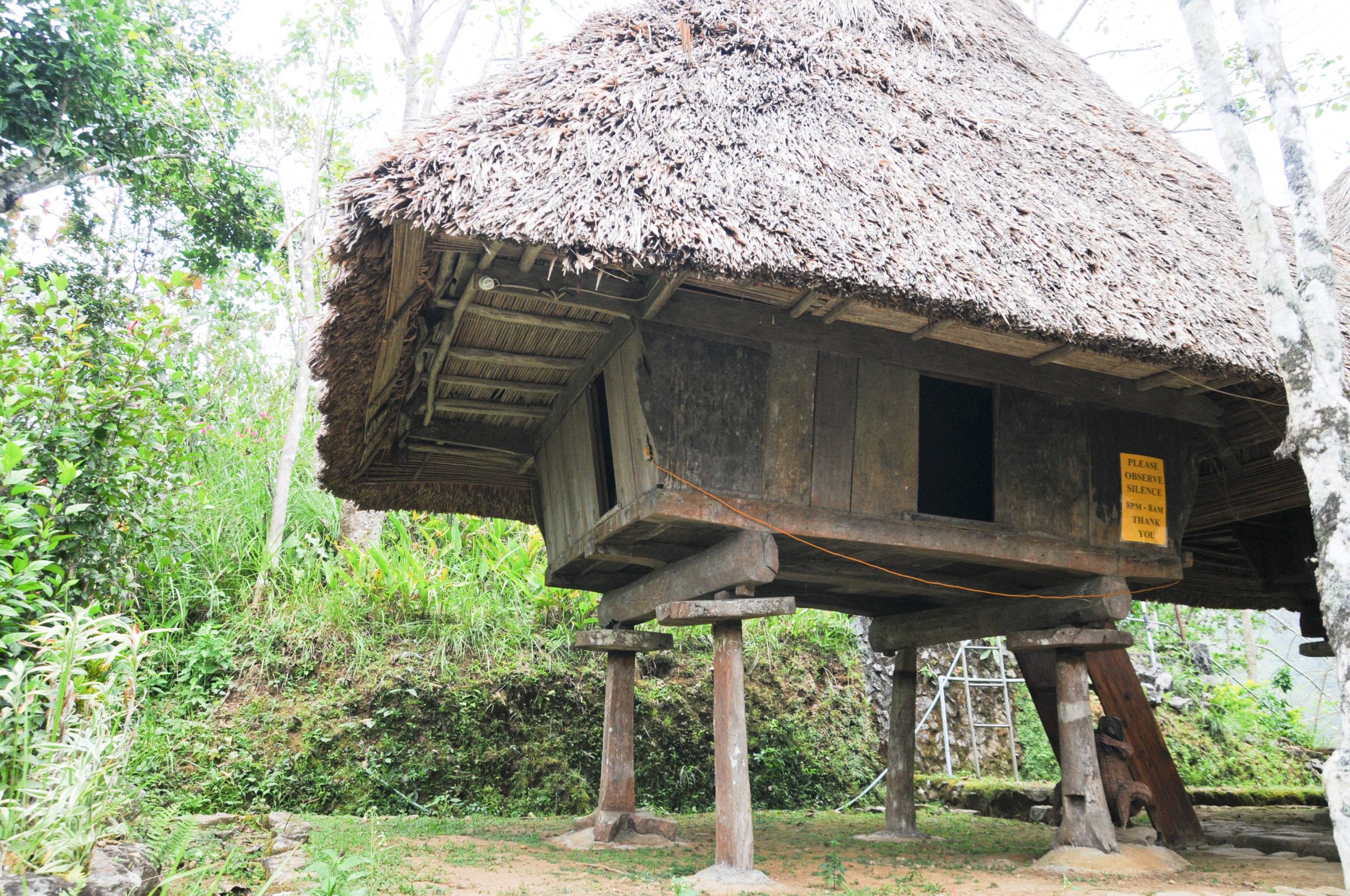 Les habitations traditionnelles des tribus Ifugao sont des huttes surélevées comprenant une seule pièce pour toute la famille. On y accède par une échelle, tandis que toutes sortes d’animaux vivent en parfaite harmonie au pied des huttes : coqs, poules, canards, chiens, chats, cochons…