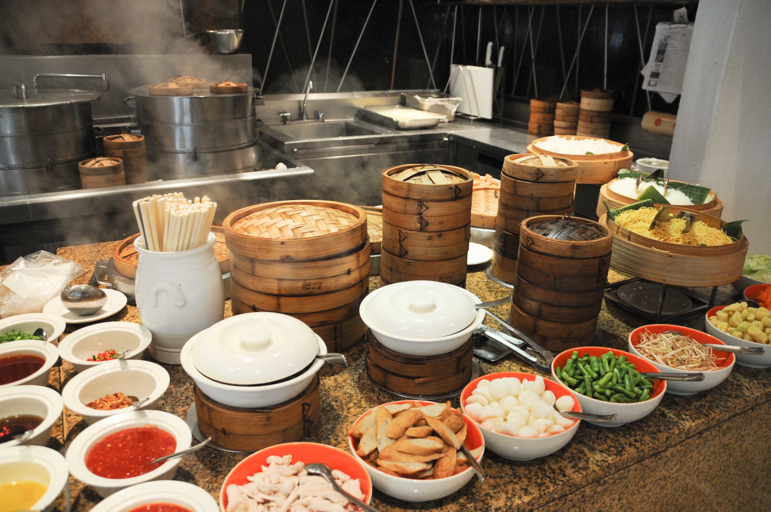 Cinq restaurants au Shangri-La, 120 cuisiniers, jusqu’à 1500 couverts par jour avec des salles immenses qui peuvent être réservées pour des banquets lors d’événements internationaux… les cuisines s’étendent sur des centaines de m²!