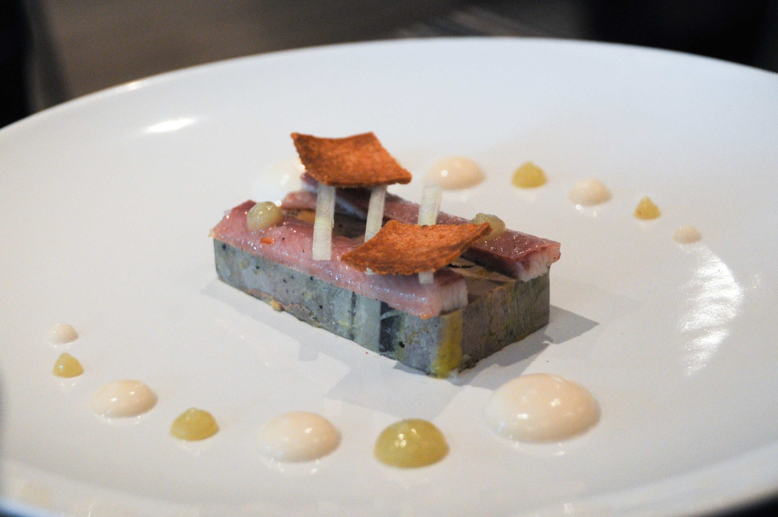 Mi-cuit de foie gras et anguille fumée, pommes et chou-fleur