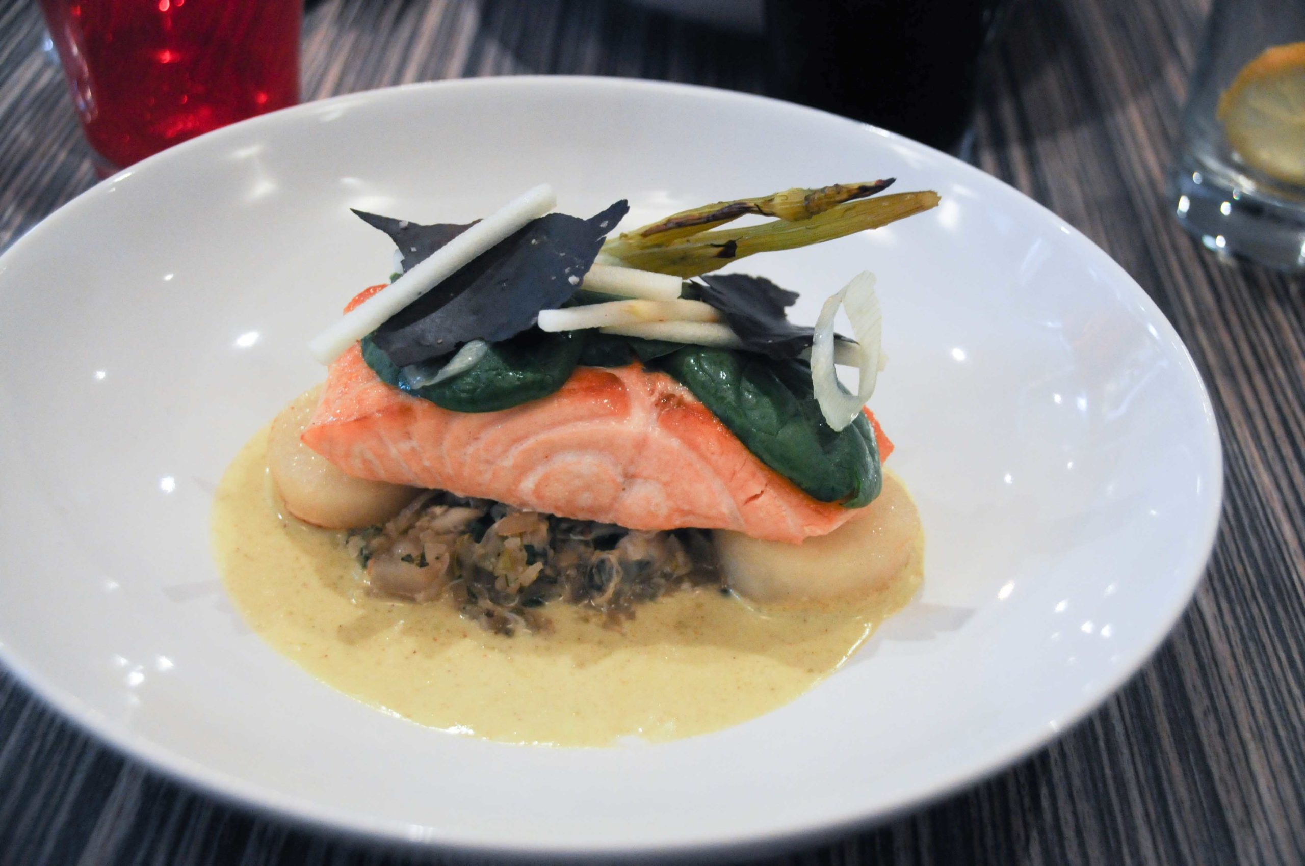 Saumon, fenouil confit façon gribiche, chair de tourteau et curry