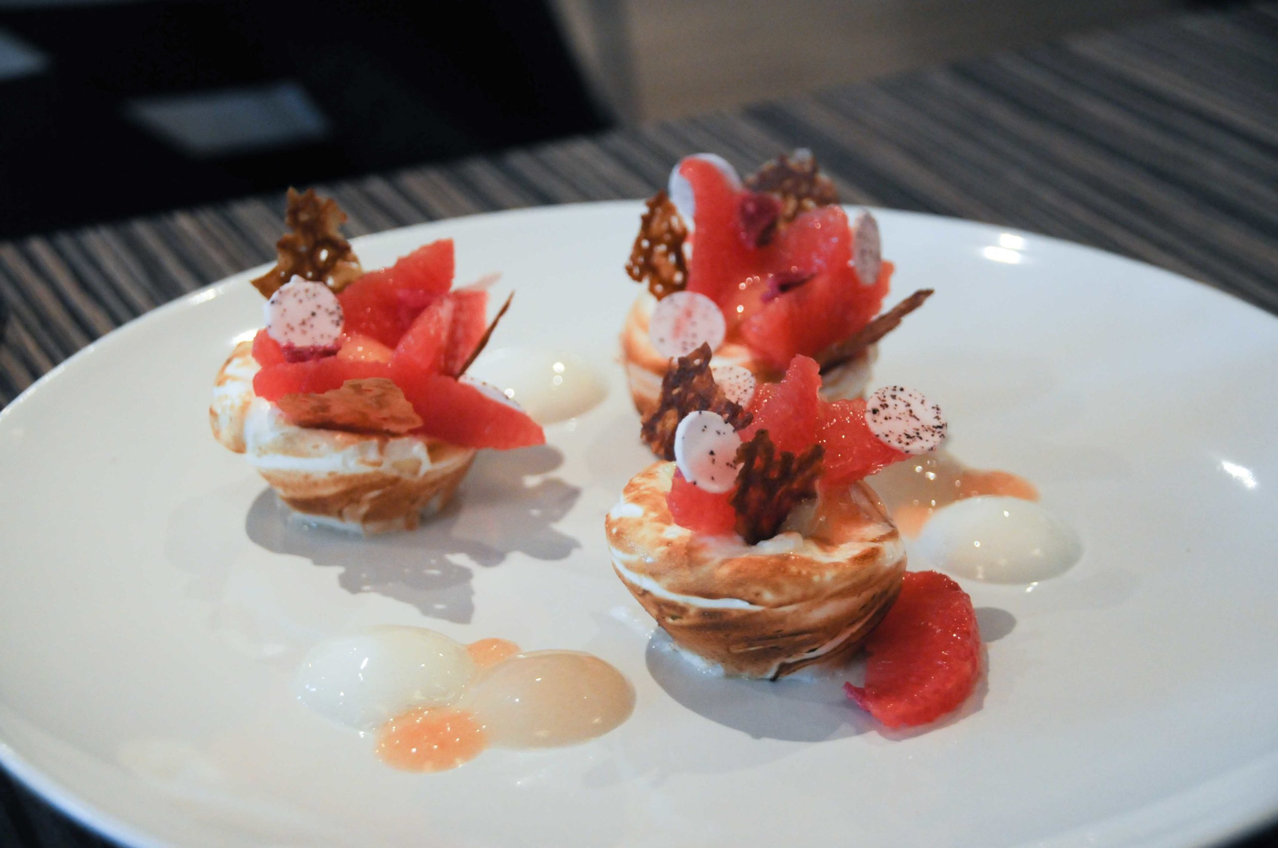 Pamplemousse en fine coque meringuée infusé à la rose, coulis de litchi