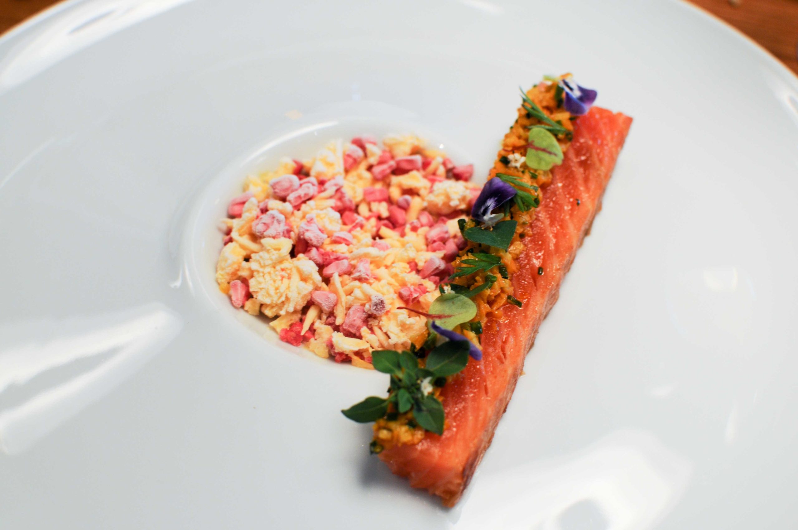 Complètement fan de la texture fondante de ce saumon cuit au sel et associé à une brunoise d’écorces d’oranges confites et d’éclats de framboises. Maîtrise absolue, on se laisse guider par les saveurs, ça claque, on adore.