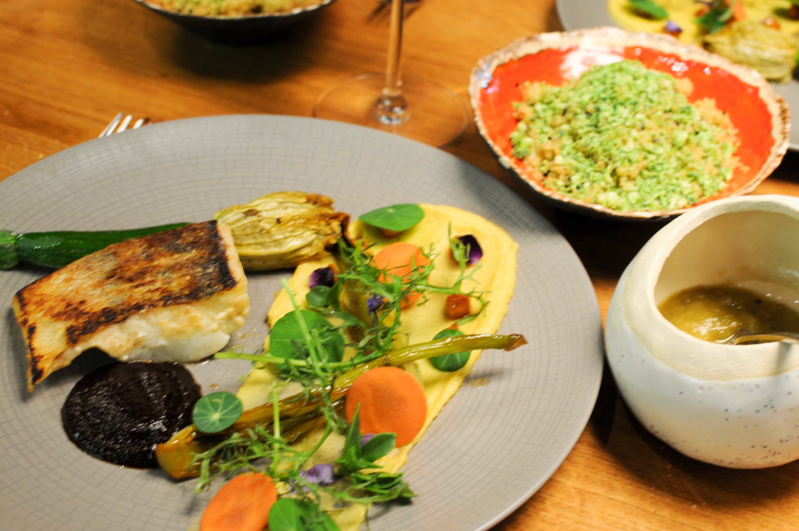 Filet de sandre poêlé au beurre noisette, purée de pois chiche à la nigelle, ketchup de tomates vertes caramélisées, fenouil glacé au miel, pois chiches grillés, fleur de courgette farcie aux légumes, jus de réduction de couscous… et semoule / semoule de brocolis en accompagnement. Un plat justement épicé qui invite au voyage, un mélange de saveurs douces ou plus ou moins corsées, un plat où l’on retrouve toute la générosité du Chef et qui se déguste avec les yeux avant de séduire les papilles. Tous les sens sont en éveil, un très très beau plat.