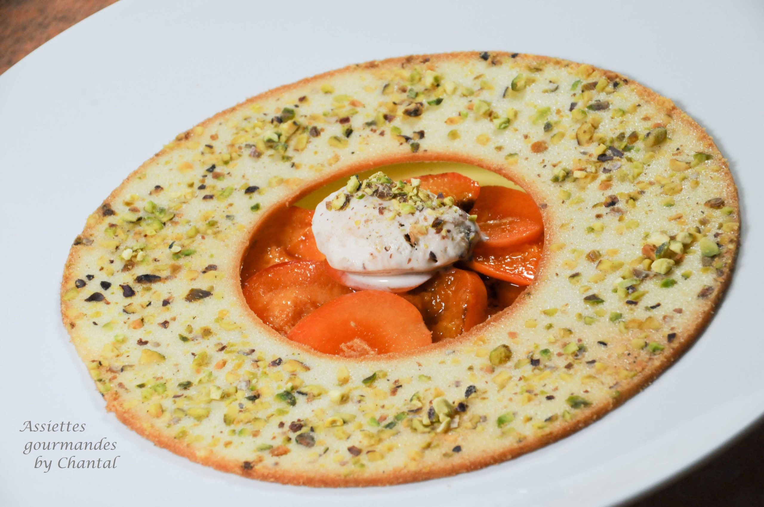 Blanc-manger à la badiane, abricots crus cuits et croustillant aux pistaches