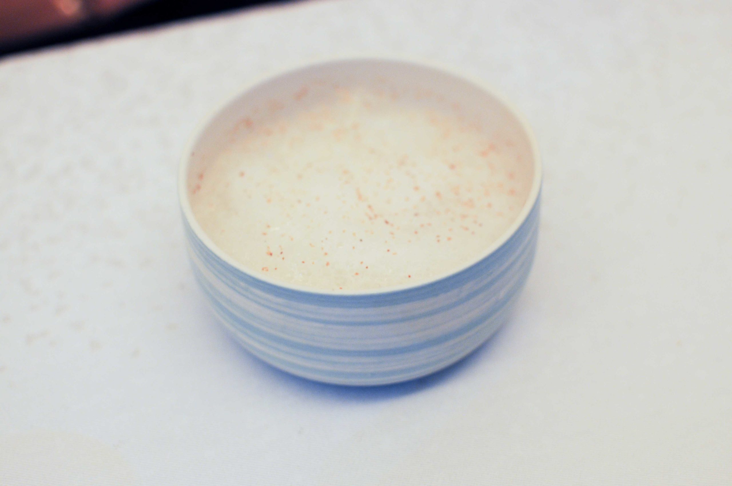 Grand classique de Thierry Marx, ce risotto sans riz se décline au fil des saisons, parfois avec de la truffe. Le soja est coupé finement au couteau, chaque morceau fait la taille d’un grain de riz! L’huître est pochée et donne un côté maritime qui s’accorde à merveille, toujours un très grand moment d’émotion en dégustant ce plat!