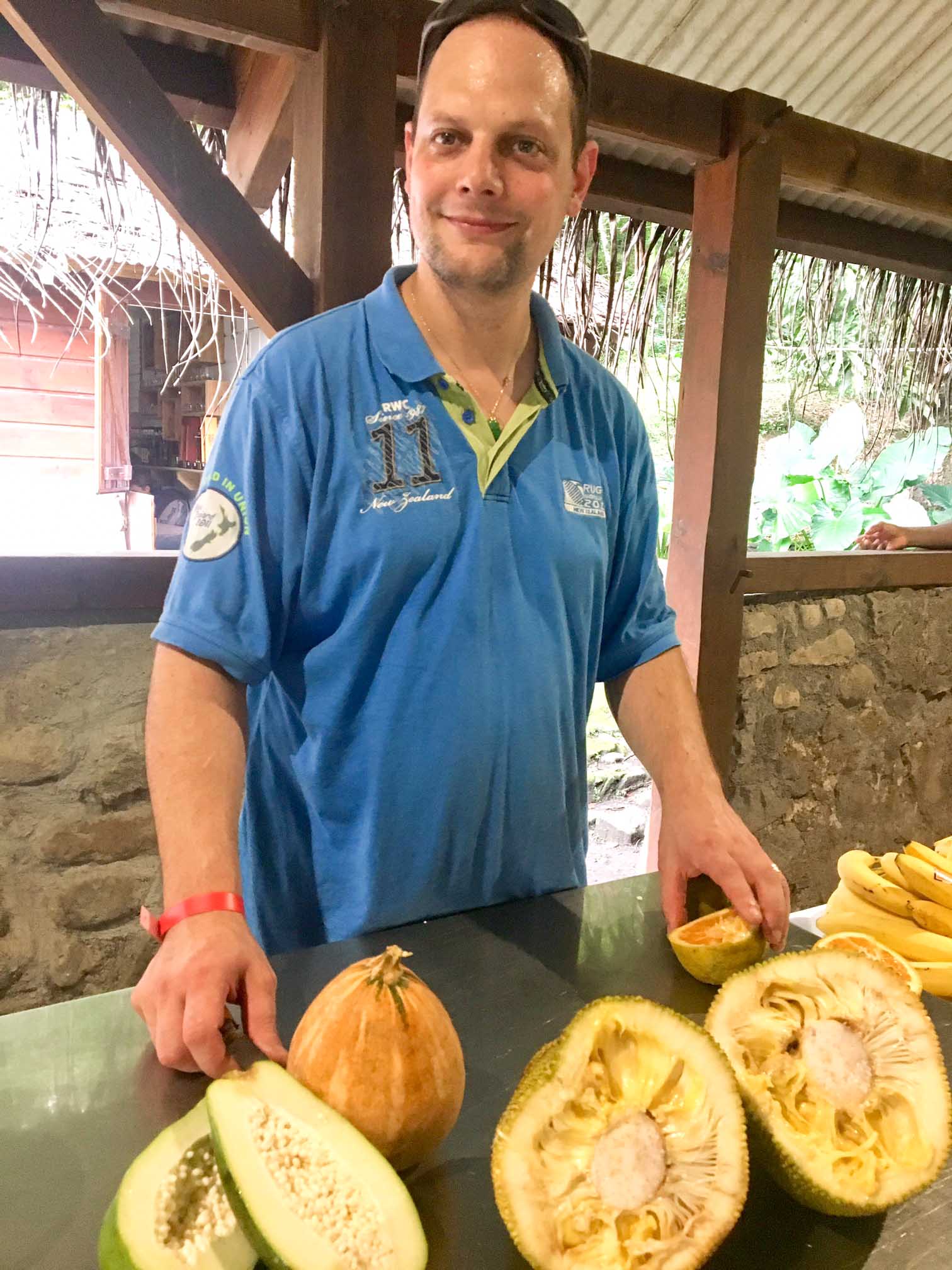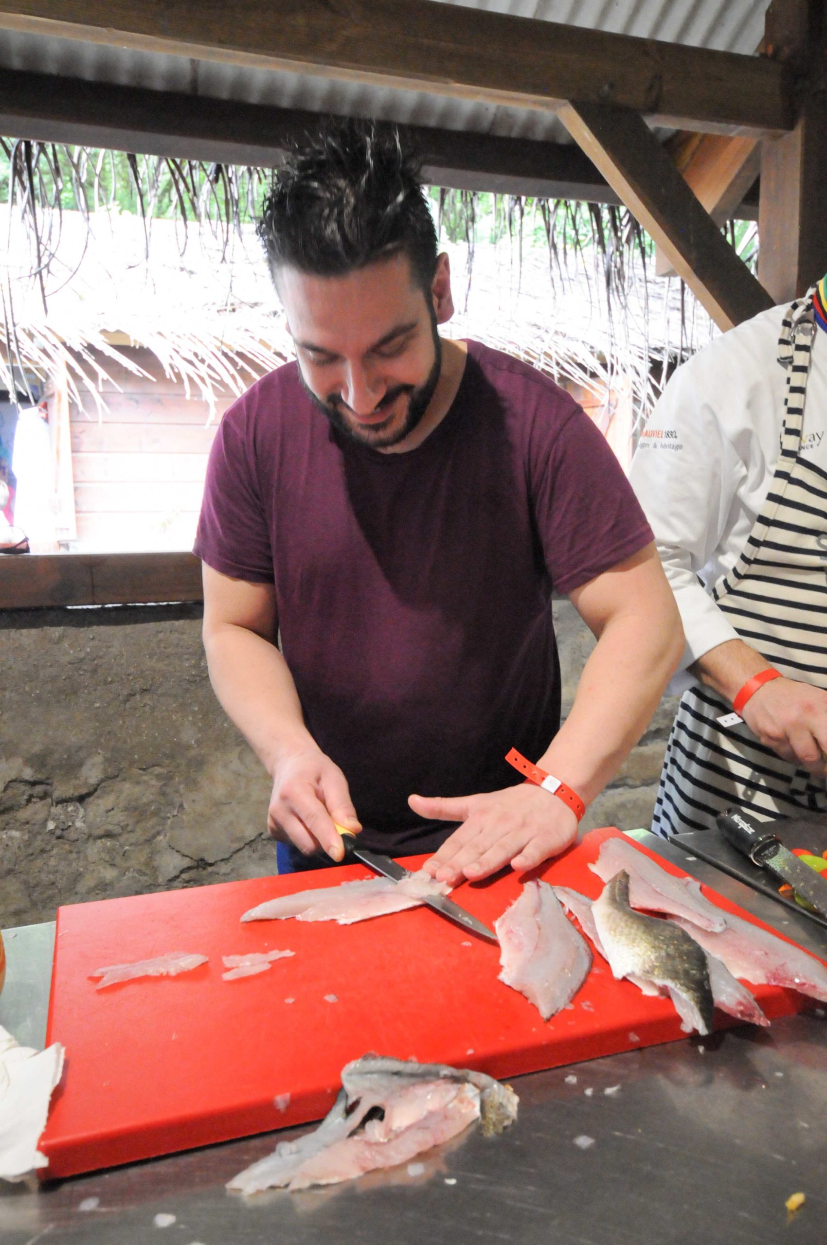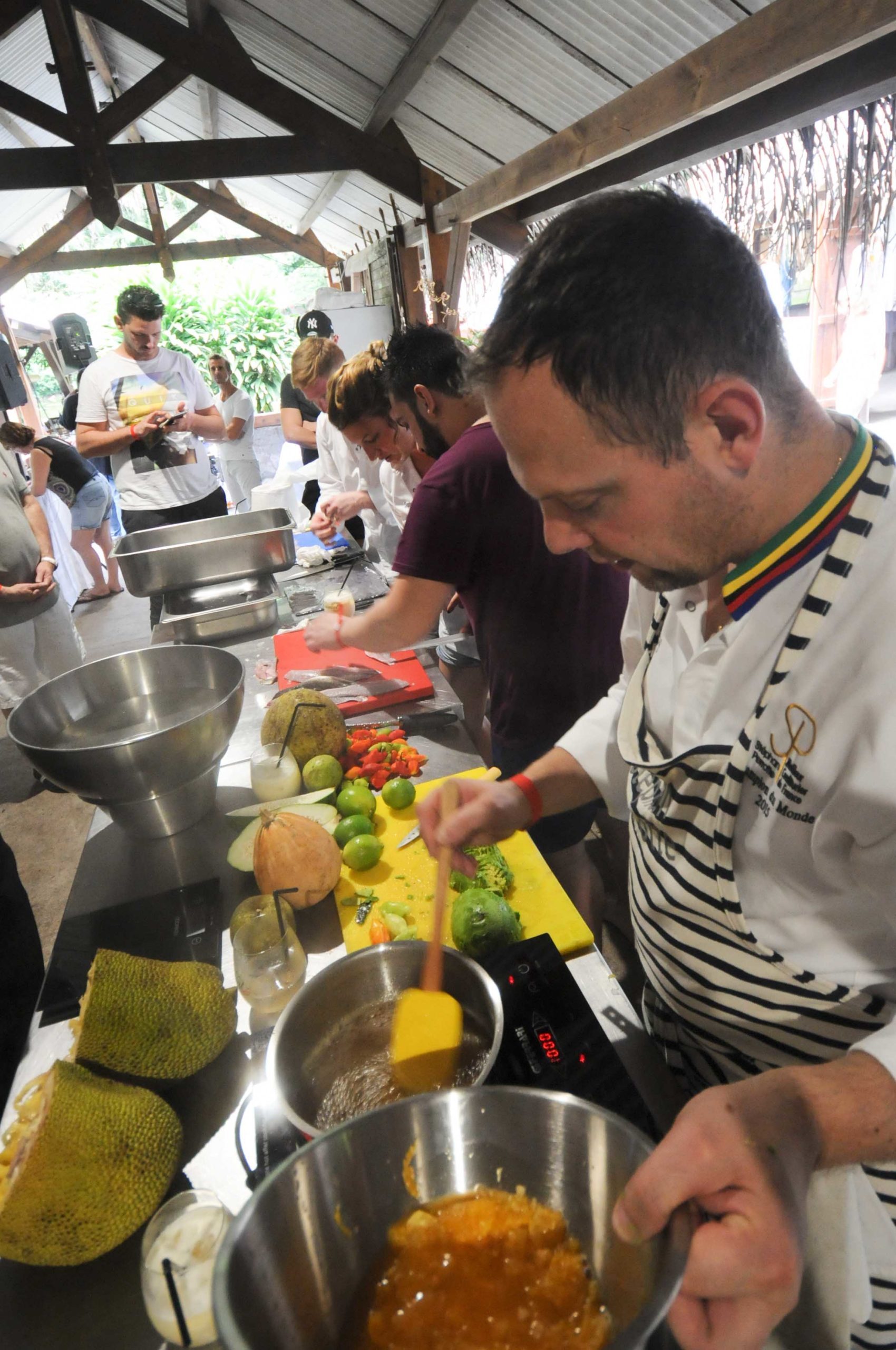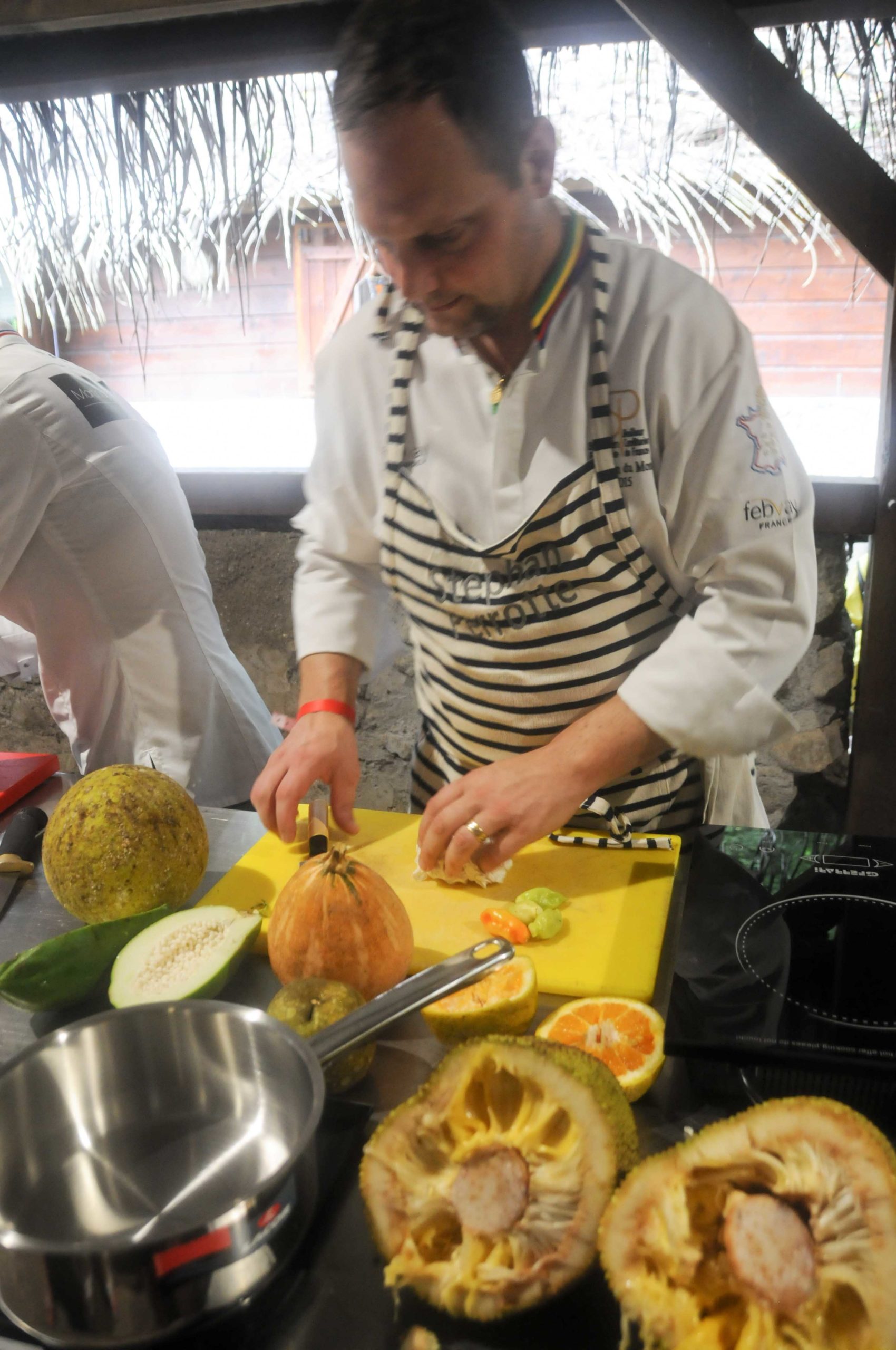 Pendant ce temps, Stephan Perrotte, Meilleur Confiturier de France 2014 et Champion du Monde 2015 de la Confiture réalise une délicieuse confiture avec les fruits locaux: