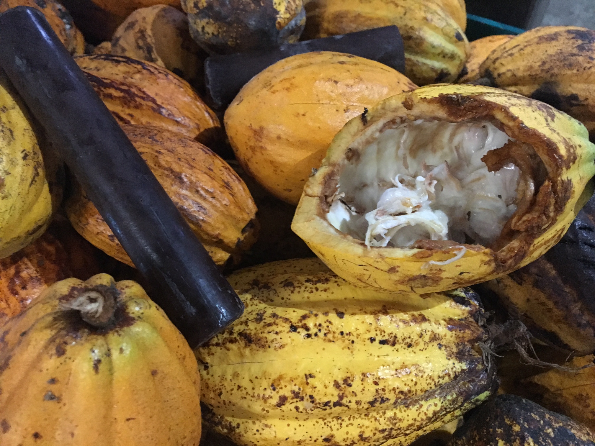 A maturité, les cabosses sont récoltées puis ouvertes; c’est l’écabossage; à l’intérieur, on récupère les graines enveloppées dans une pulpe blanche, visqueuse et sucrée appelée le « mucilage »; elles sont alors mises en fermentation pendant environ une semaine. Chaque cabosse contient entre 30 et 60 fèves.
