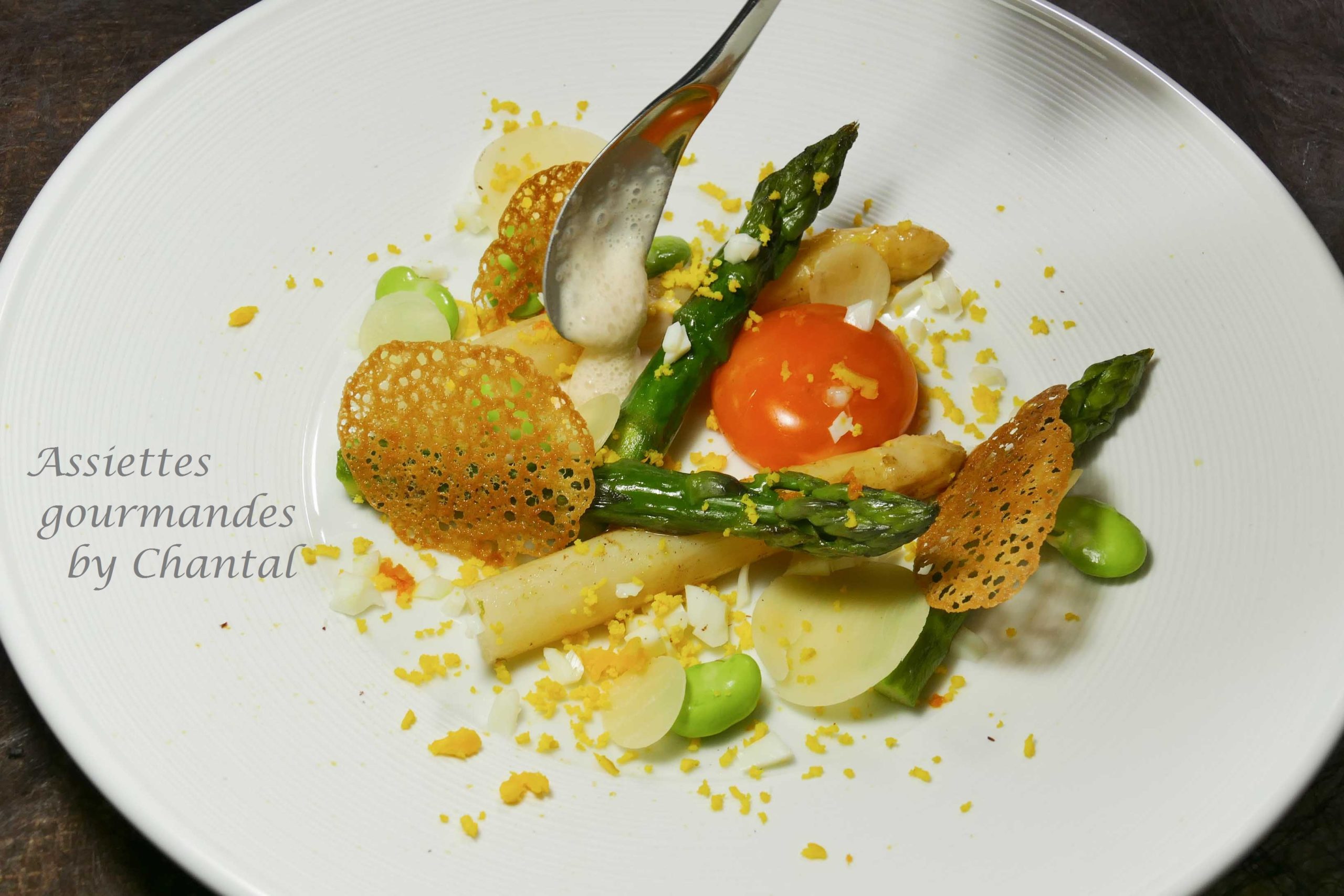 Disposer les asperges dans une assiettes. Déposer un jaune d’oeuf. Ajouter du zeste d’orange, des lamelles de Comté et des fines tuiles de pain.