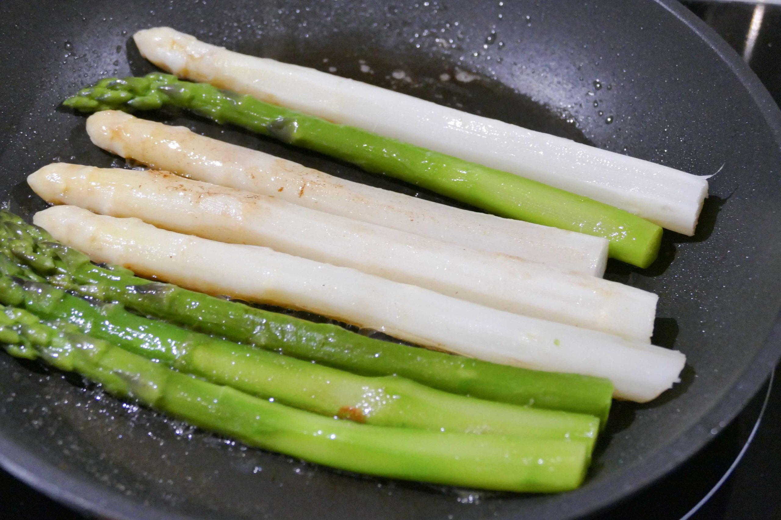 Eplucher les asperges et les cuire 5 minutes dans l’eau bouillante salée puis les rafraîchir à l’eau glacée. Les égoutter et rôtir vivement à la poêle dans une noisette de beurre.