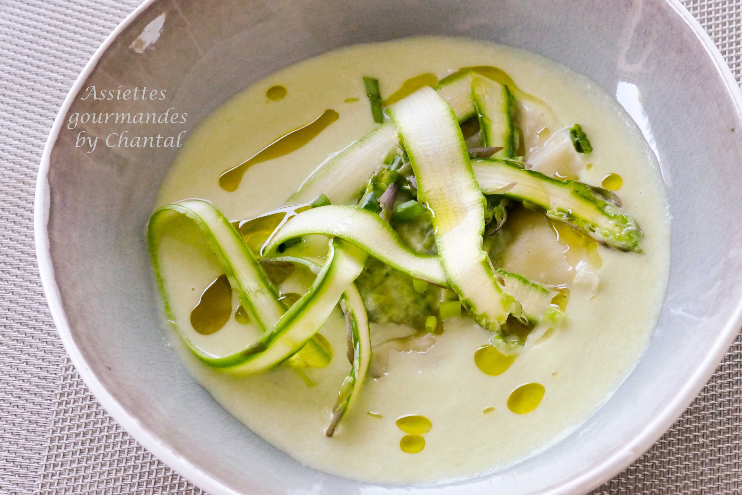 Verser la « soupe » d’asperges, et déposer les lanières d’asperges crues sur le dessus (on peut aussi lustrer les lamelles d’asperges avec de l’huile d’olive).