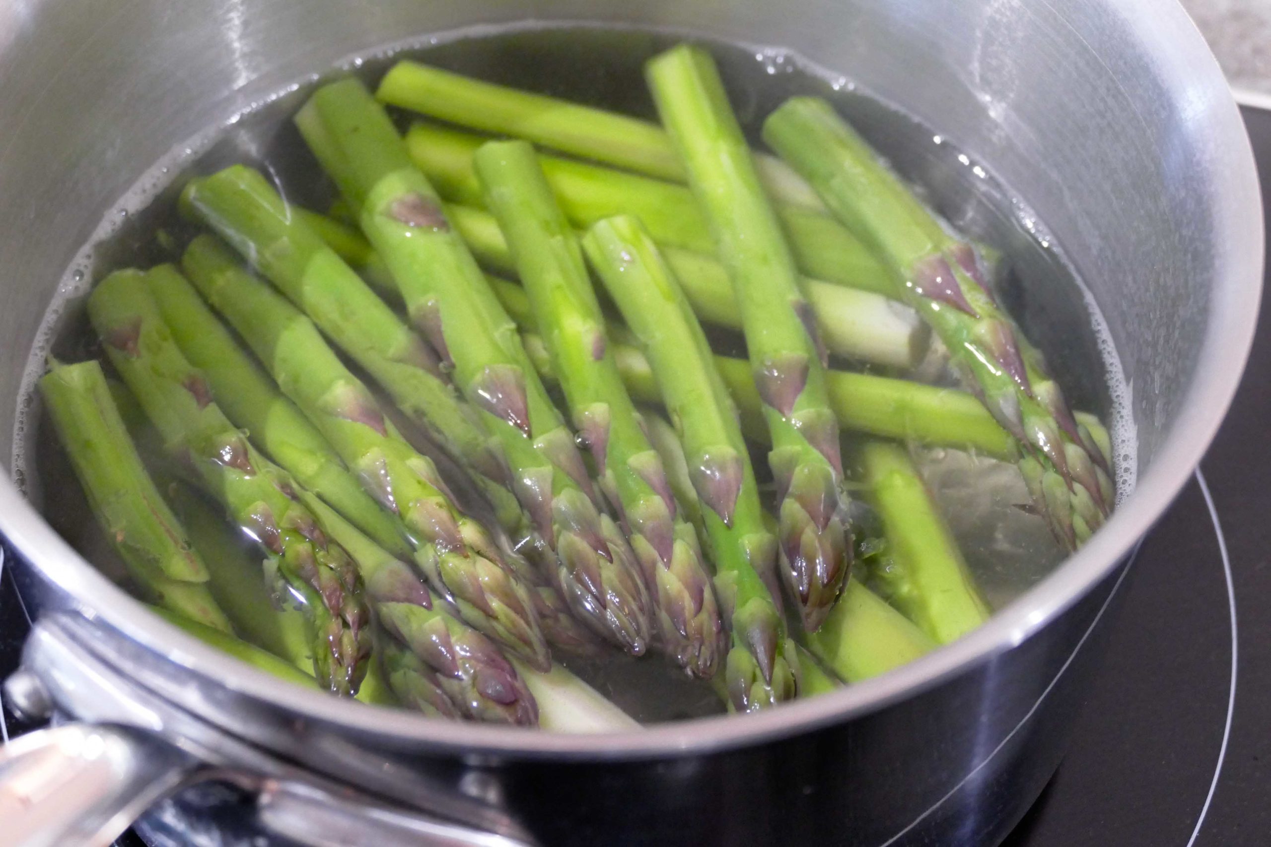 Nettoyer les asperges ; en réserver 2 que l’on ne fera pas cuire et que l’on découpe en fines lanières avec un économe.