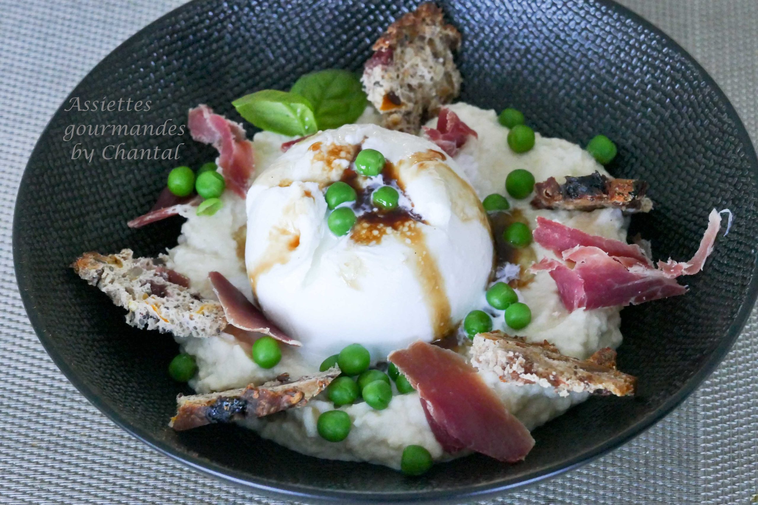 1 burrata, 1 boite de fonds d’artichaut (250 g net égoutté), 3 cuil. à s. de crème, 1/4 citron, lamelles de pain, 1 poignée de petits pois, fleur de sel, poivre blanc de Kampot, vinaigre balsamique, huile d’olive, lamelles de jambon (et au gré de vos envies, copeaux de Parmesan, basilic…)
