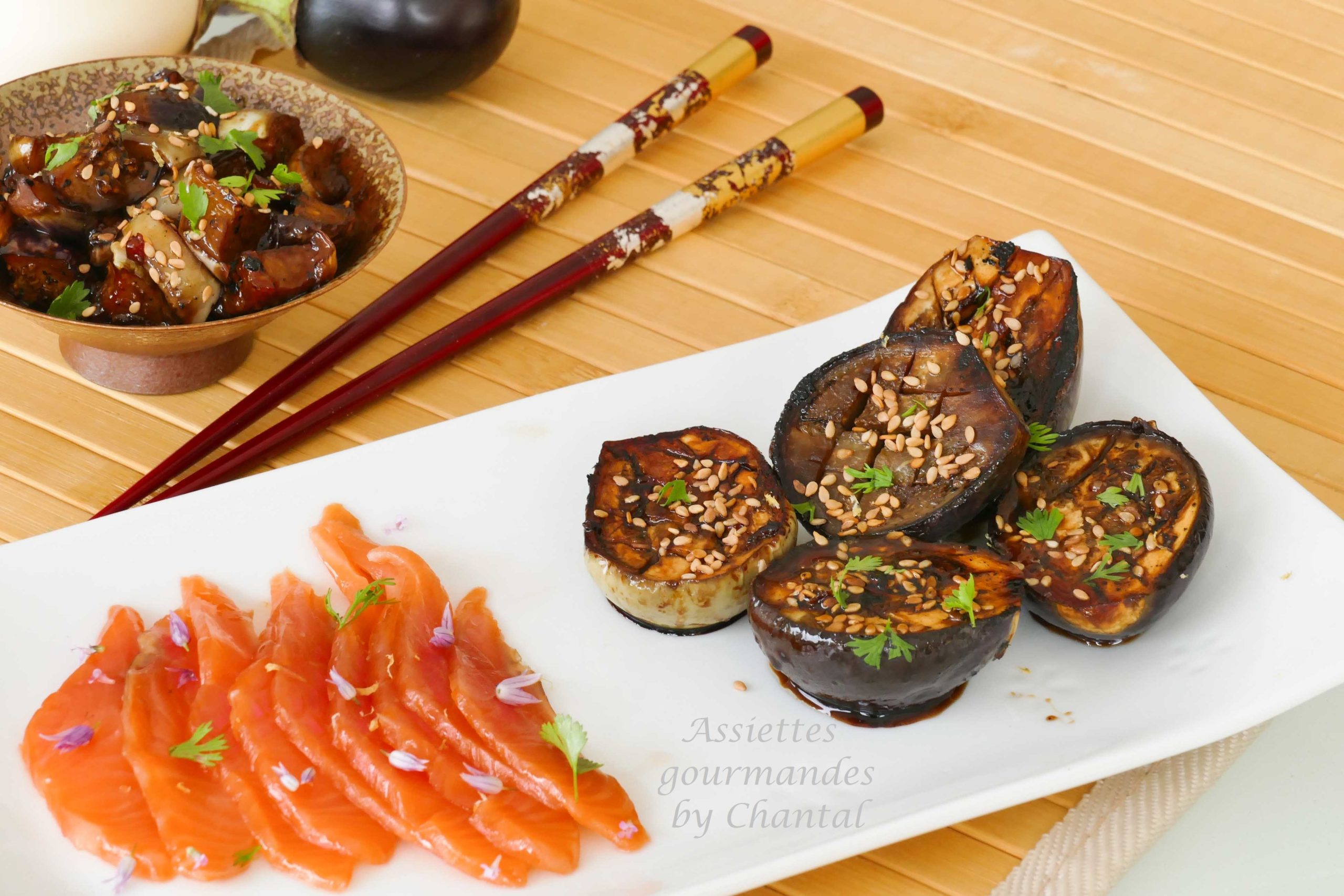 Au Japon, l’aubergine fait partie des accompagnements très prisés (avec le riz of course) et je peux vous assurer que dans cette recette les aubergines seront fondantes, tendres, savoureuses … et pas grasses du tout!