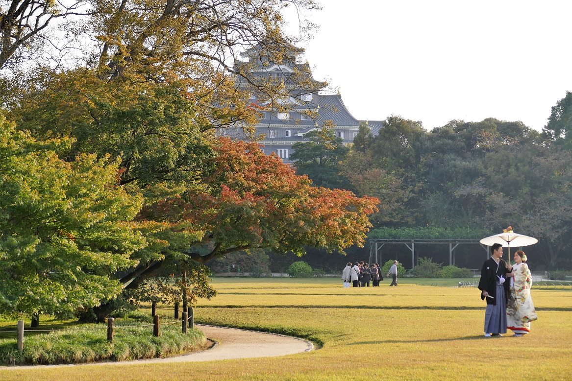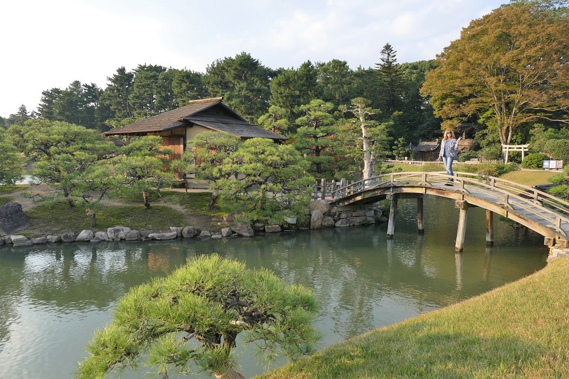 Le château est remarquable, dominant la rivière Asahi. Sa couleur sombre et ses dorures lui ont valu le surnom de Corbeau d’Or ; il suffit de traverser la rivière par un petit pont pour se retrouver dans Korakuen, le parc face au château. Ce vaste jardin est une pure merveille, on y trouve des essences d’arbres très différentes, pruniers, cerisiers, bambous, plantations de thé… des collines artificielles, des étangs… mais l’ensemble a conservé un caractère authentique et traditionnel assez épuré.