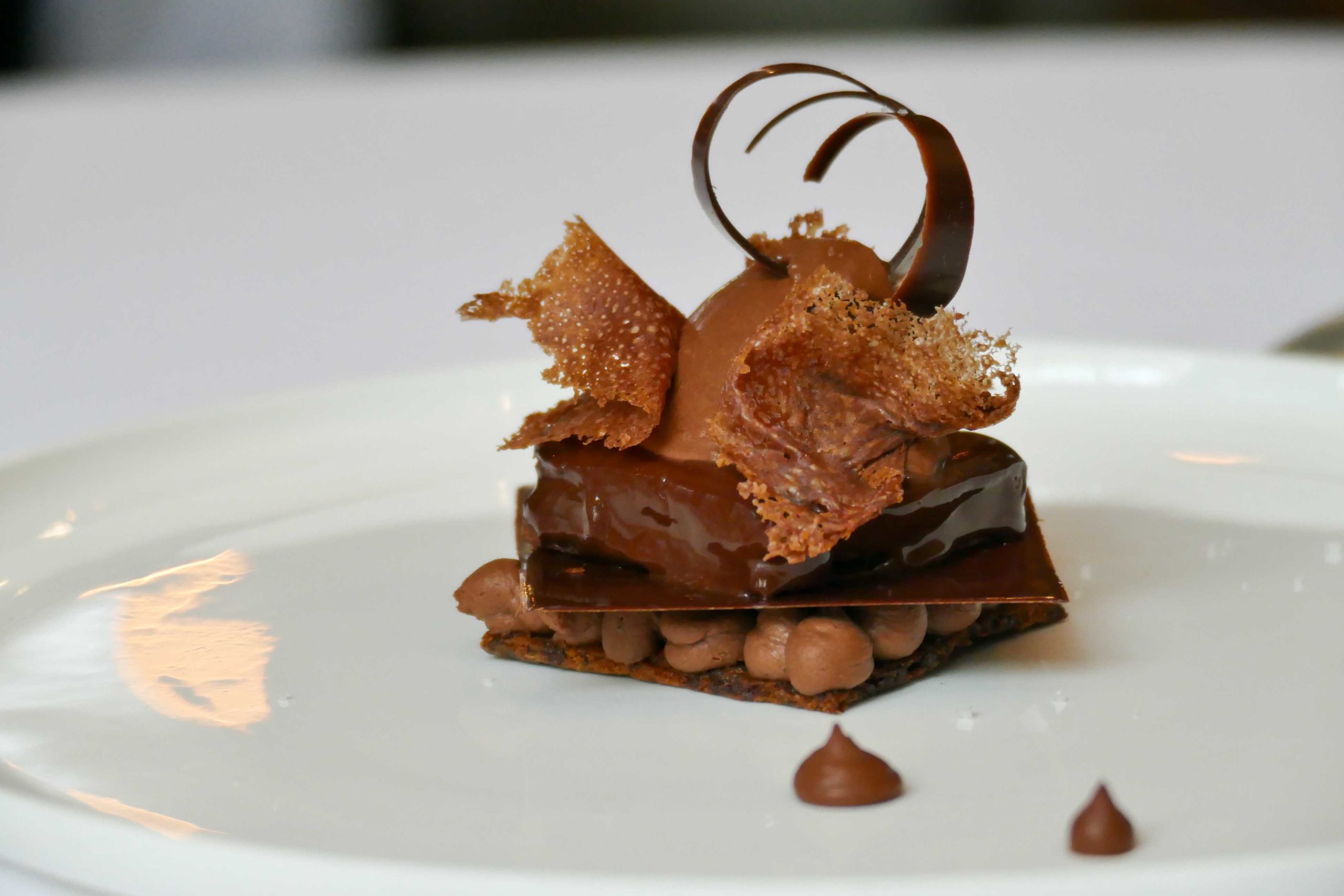 Biscuit chocolat, ganache cardamome, feuille de chocolat noir, mousse et sorbet cacao… On est dans une déclinaison autour du chocolat dans tous ses états, le mariage avec la cardamome est très réussi, j’adore. #chocolatelover ^_^