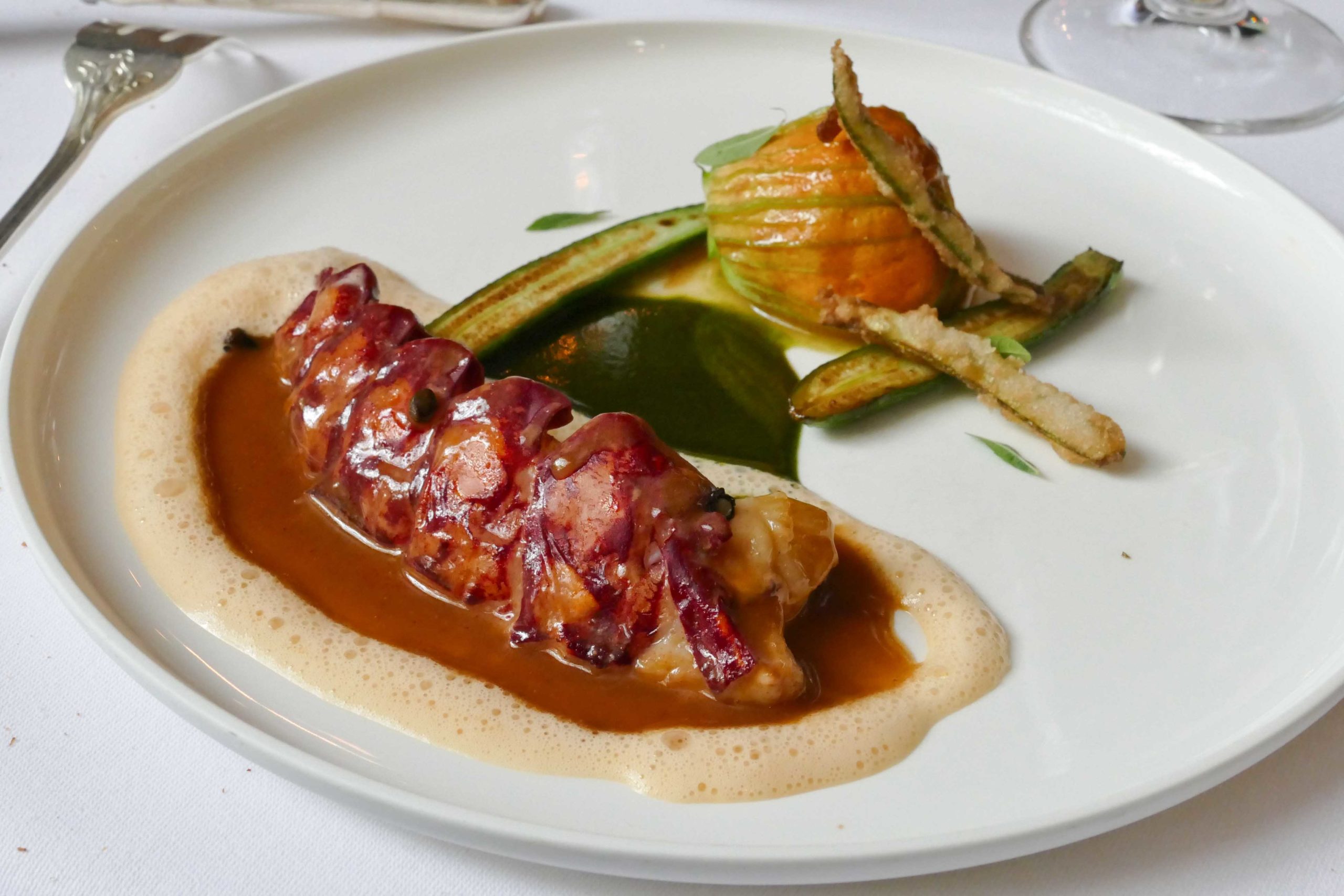 Un autre plat d’exception où tout est brillamment exécuté. La cuisson du homard est superbe, les saveurs sont explosives, ça sent bon la verveine citronnelle, les épices, c’est relevé, puissant mais très équilibré, du pur bonheur. La fleur de courgette est farcie d’un mélange avec les pinces et coudes, quelques petites courgettes en tempura pour accompagner… un plat dont on se souvient longtemps.