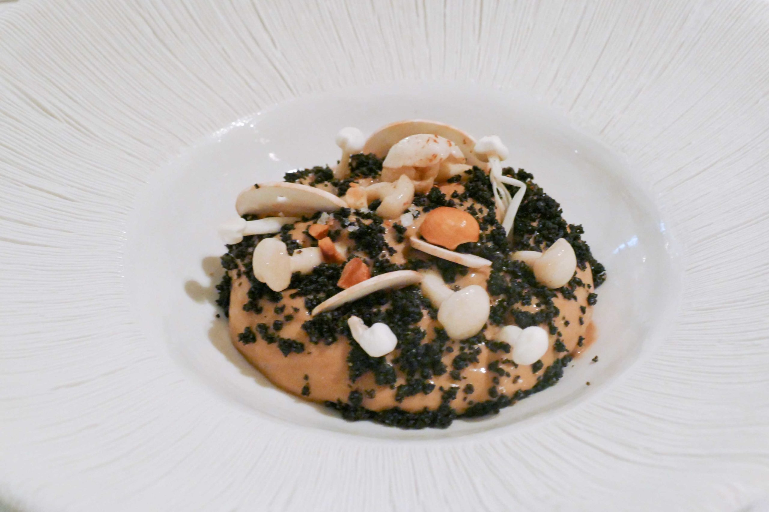 A souligner, la magnifique vaisselle signée Virginie Boudsocq, avec une assiette striée qui imite l’intérieur d’un champignon, raffinement extrême.