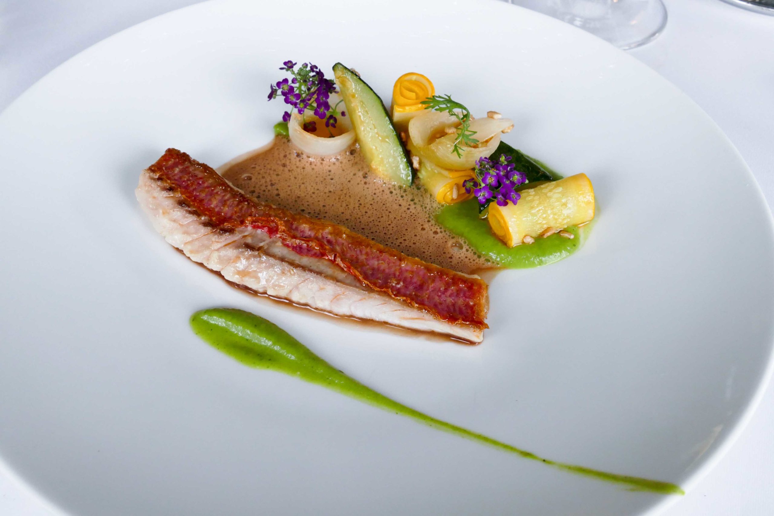 Filet de rouget cuit à la plancha, jus d’arête corsé, courgette marinée et confite, huile de crustacé et riz grillé: un joli travail sur les textures, c’est goûteux, équilibré, sans faute.