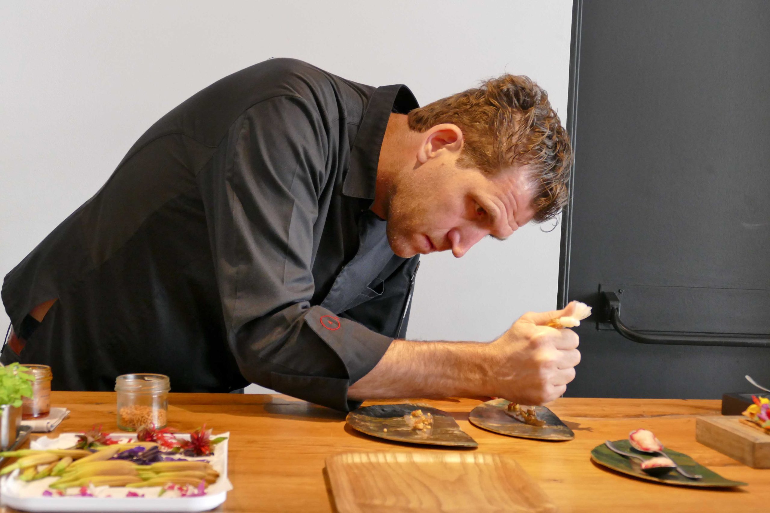 Chénopode en tempura/ oeufs de brochet/piment; rouget/jus de canard/framboise harissa; miso de coquilles d’huîtres; aubergine/passion/noix de cajou