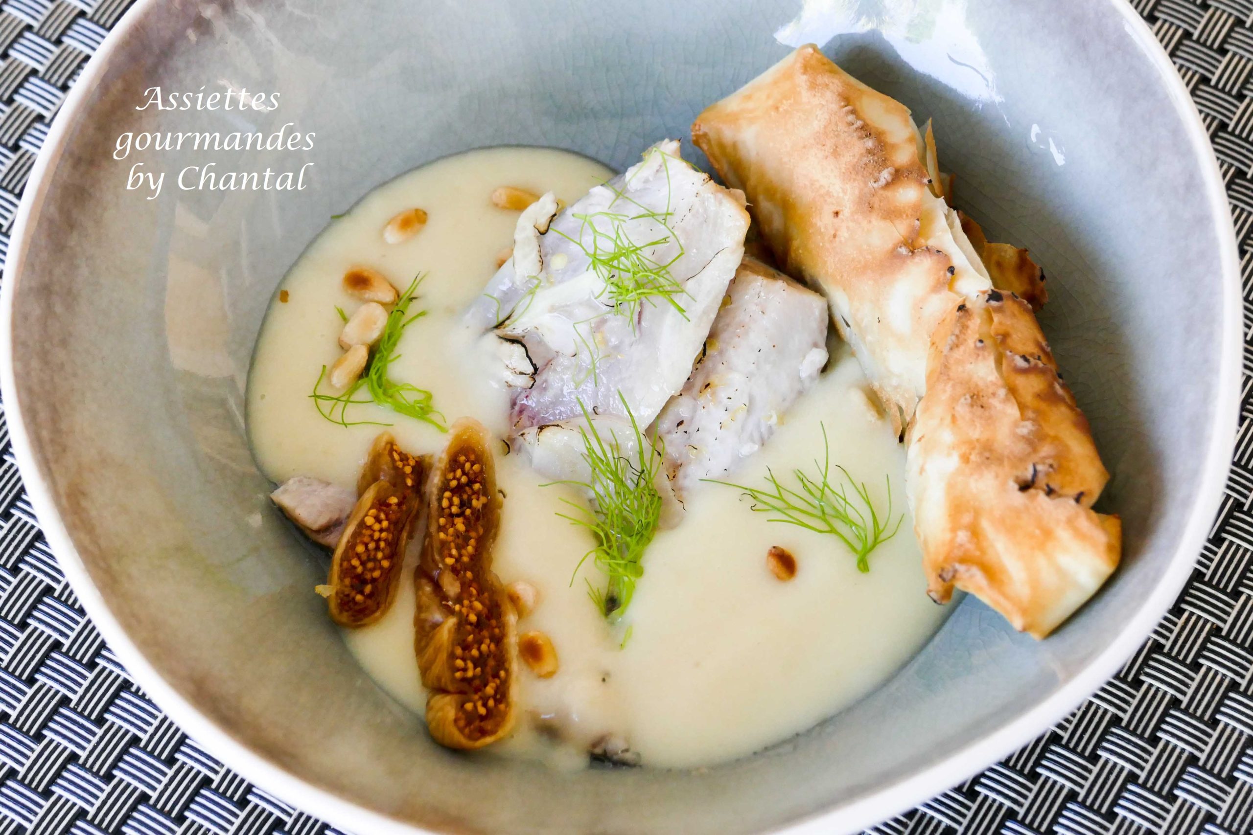 Verser le coulis de fenouil froid, ajouter les pignons, quelques lamelles de figues et servir aussitôt avec le croustillant de caviar d’aubergines.