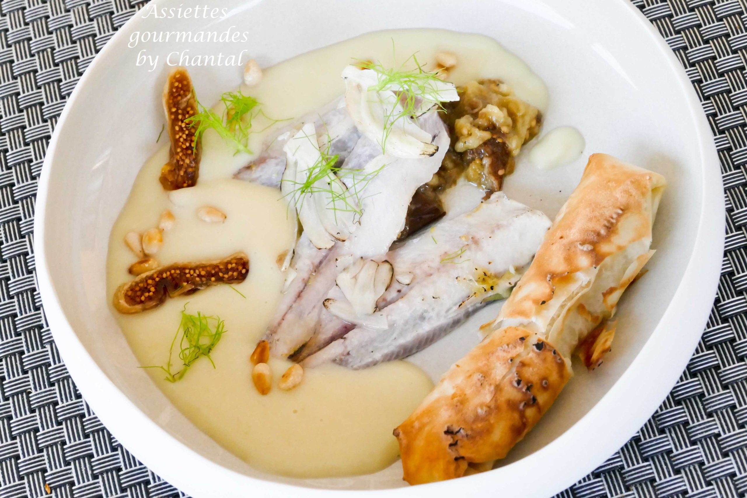 C’est au restaurant Lauza que cette entrée avait été servie et j’avais gardé l’idée en tête ; la vinaigrette au café s’associait aussi bien avec les sardines qu’avec le fenouil, pas de figues fraîches pour le croustillant mais c’est pas grave, je m’adapte avec 2 aubergines et je ferai un caviar d’aubergine en croustillant.