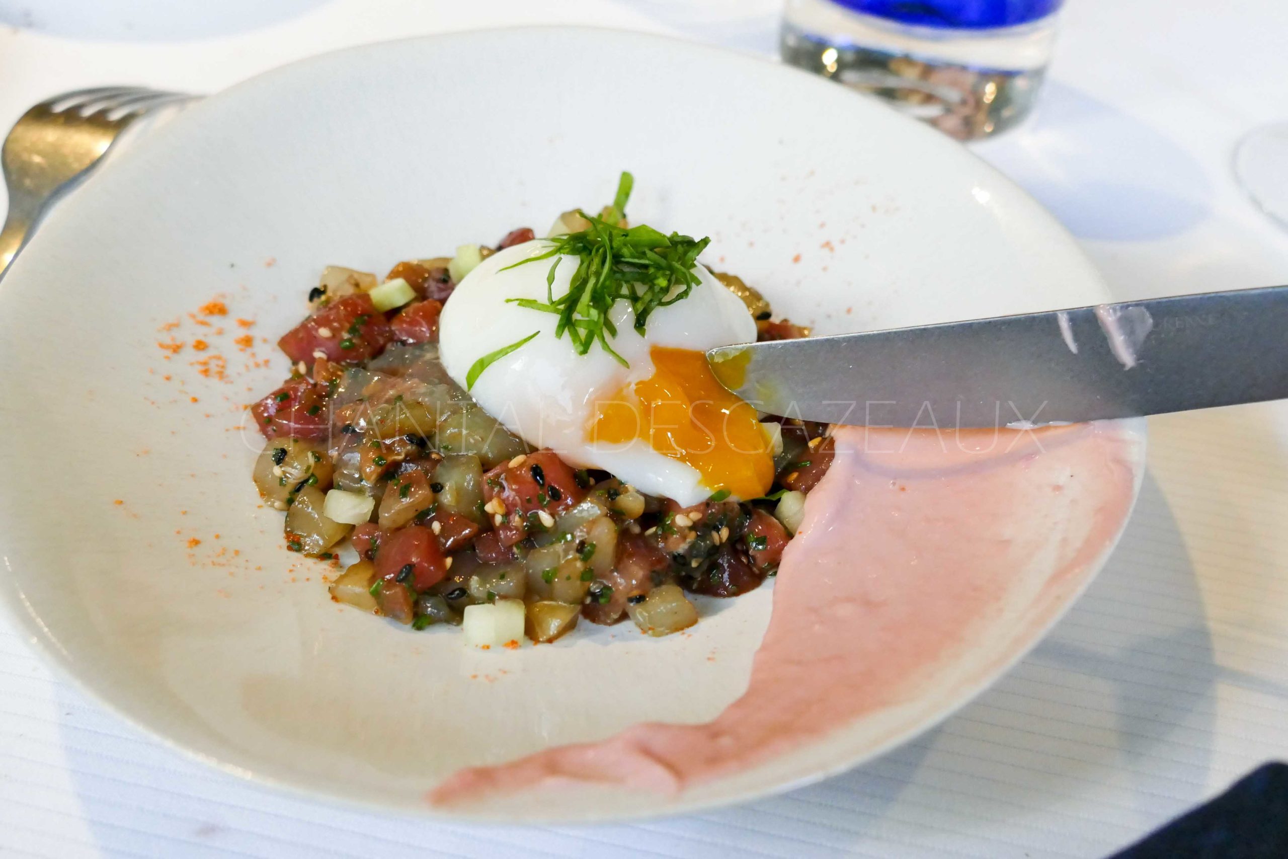 Tartare maigre et thon rouge, oeuf poché, mayonnaise à la betterave, gelée d’algues Kombu